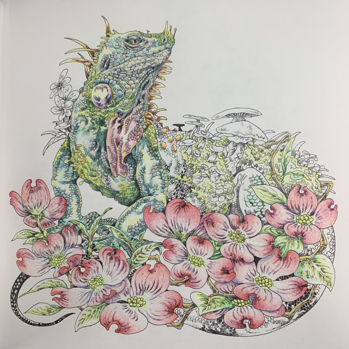0 3 #マツダケン塗り絵集 より 「春尾」の途中経過 イグアナ上半身まで出来た #大人の塗り絵 #色鉛筆 21/04/25 18:51
