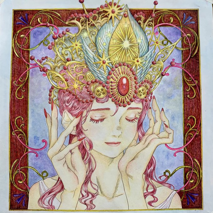 6 45 完成 宝石と背景は #インクテンス色鉛筆 で塗ってみた。 細かい所頑張った割には写真に反映されて無いのよね🥲 #大人の塗り絵 #黒イ森ぬり絵ブック #色鉛筆 各種 23/03/26 15:51
