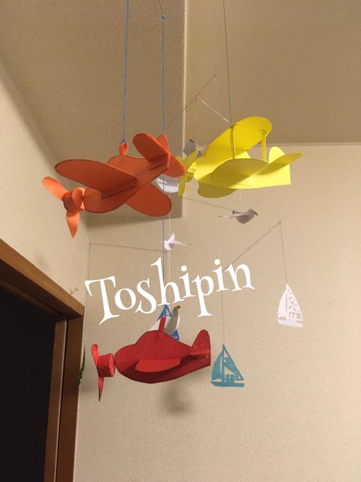 1 3 昨日作ったペーパーモビール。プロペラ機。 なんとなくイメージしたのを画用紙で作って→型を厚めの紙で作る→色画用紙でカット→ボンドで貼り合わせる と全てアナログに作業しますw #ペーパークラフト #モビール #handmade 20/06/07 19:06
