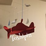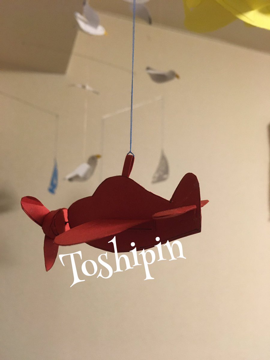 昨日作ったペーパーモビール。プロペラ機。 なんとなくイメージしたのを画用紙で作って→型を厚めの紙で作る→色画用紙でカット→ボンドで貼り合わせる と全てアナログに作業しますw #ペーパークラフト #モビール #handmade