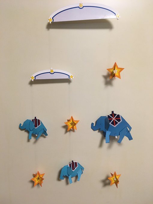 週末に作ったペーパークラフト。 置物に飽き足らずw モビールをDLしてみた。 Canonのサイトからだけど モビールキャラバンさんの作品です。 可愛い。 作ってみて ちょっとインスパイアされて 自作試作してみたら できるじゃん!って なったので色画用紙とかで再度作ってみる。 #ペーパークラフト