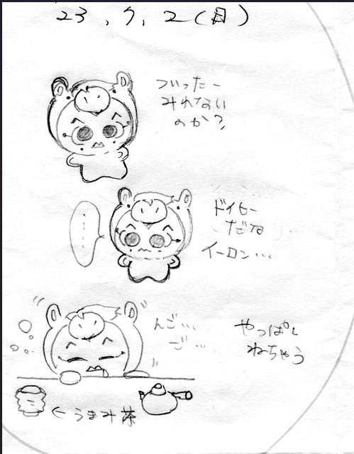 7 12 先週の日曜の落書きうまみくん (仕事中に立ったまま描いたので chu!!ドイヒーでごめん 落書きばかりでごめん) 23/07/11 19:21