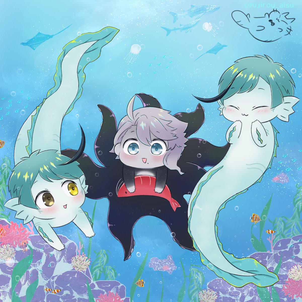 4 20 (*´◒`*)🐙🦈🐬オクタ稚魚が可愛すぎる! 色が付くとまた雰囲気が変わって良き✨ #twstファンアート #ツイステファンアート 20/08/04 18:58