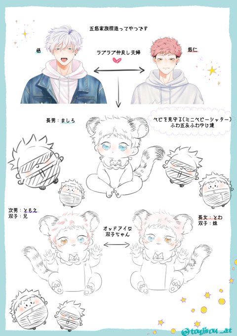 我が家の五悠家族を描いてみた✨ 子供たちの名前の漢字や年齢とか細かい所は決まってないけどこんな感じ💖🥳プピィー✨🎉