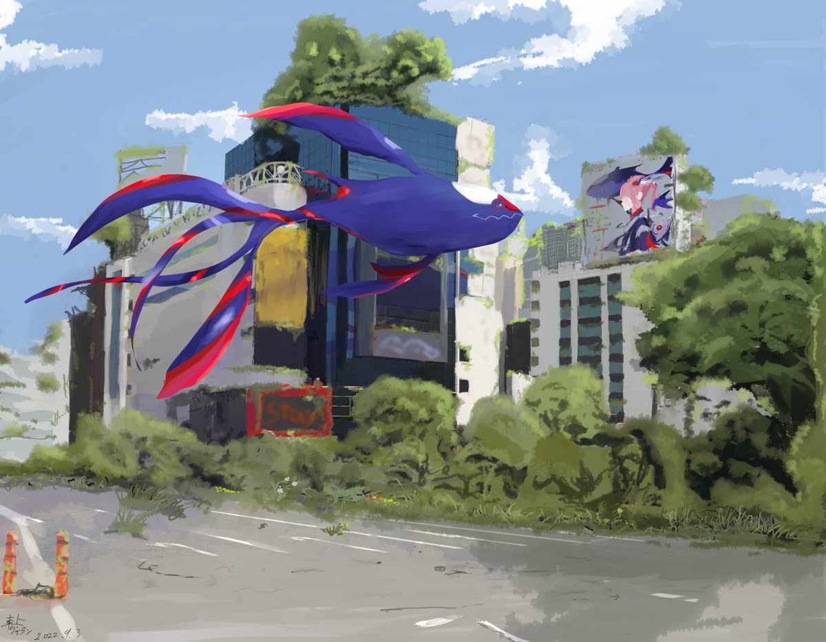 20 79 #花譜美術部 埃っぽい崩れかけたコンクリートジャングルの一角を抜けると空が見えた。 崩壊した街には緑が戻り、一層繁栄し始めた大小様々な生き物たちが夏の到来を祝福していた。 22/09/03 14:34