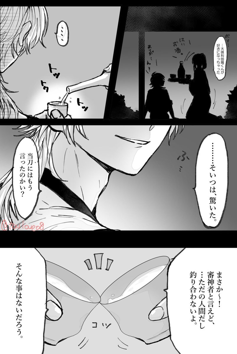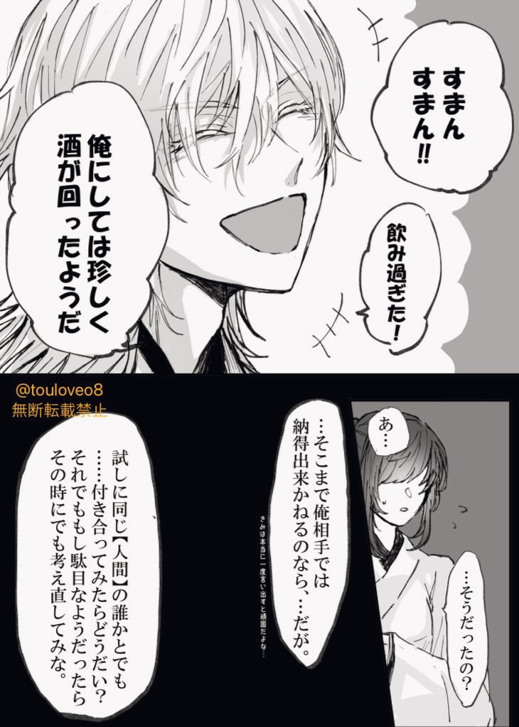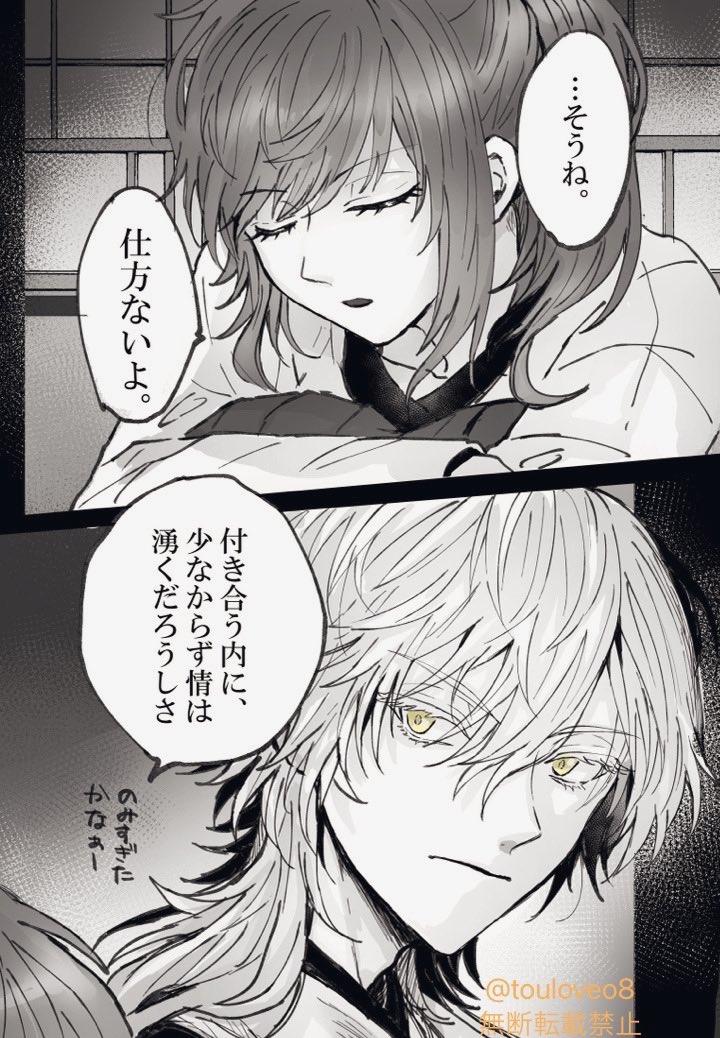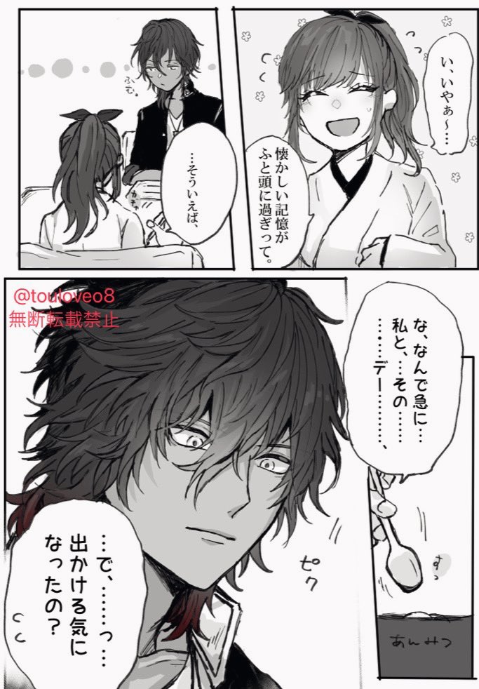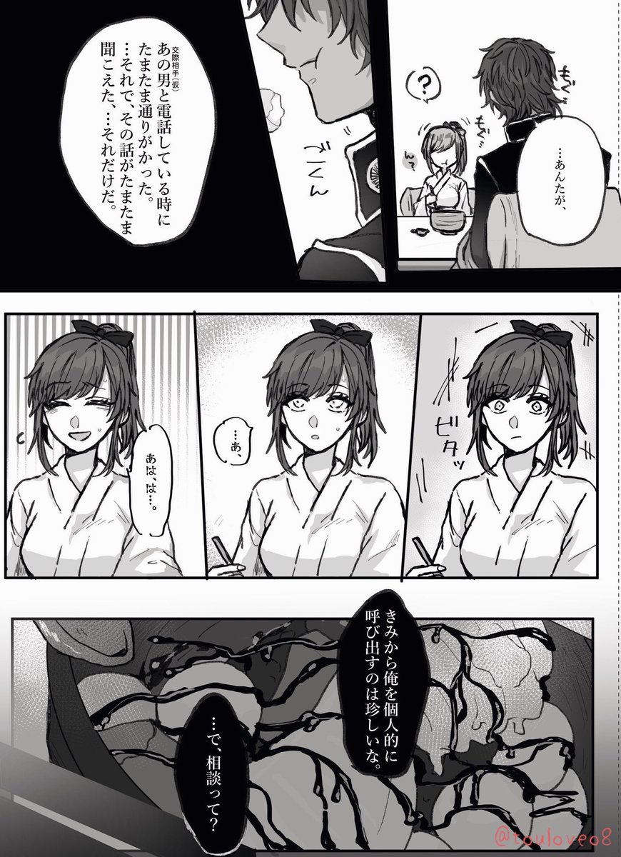 31 297 とある本丸の大倶利伽羅が 自分の審神者の彼氏の浮気現場を見てしまった話⑦ (※顔有♀︎審神者います) 回想編➕本編に戻ります! 追記(お知らせ)はツリーにつけます 23/05/01 07:39