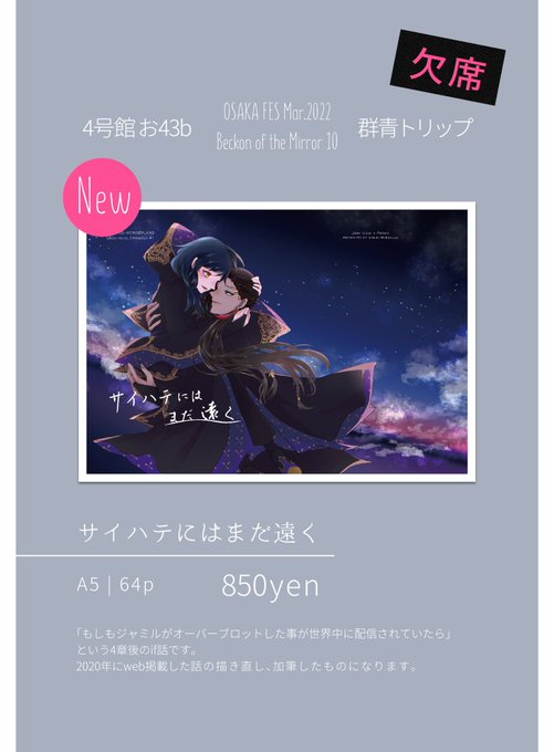📢3/27 Beckon of the Mirror 10 / 4号館お43b【欠席】 「サイハテにはまだ遠く」ジャミ監♀ A5/64p/¥850 2020年にweb掲載した話の描き直し、加筆した内容です。 イベントに合わせてBOOTHで頒布します。 支部にもサンプル掲載しました👇 pixiv.net/artworks/96881…