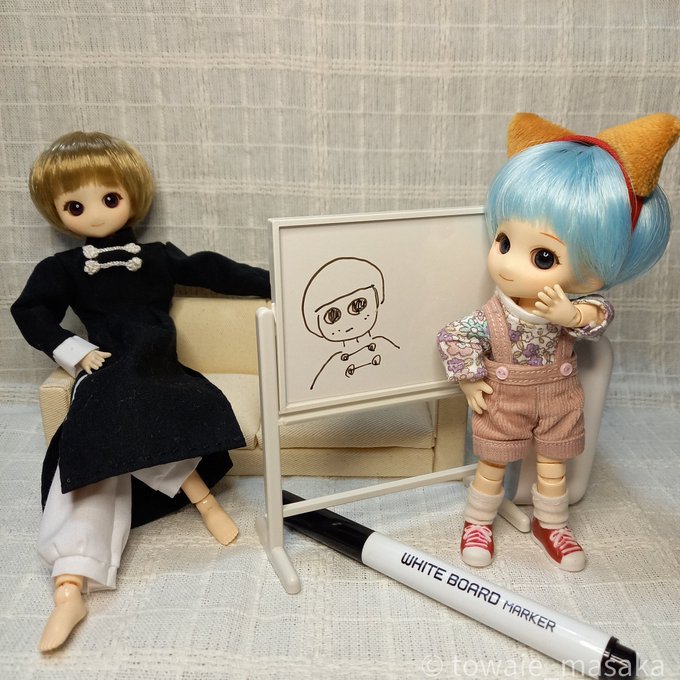 #深夜前のお題予想ドール撮影 自由 #今夜のドール撮影120分一本勝負 【でふぉるめ】 はな「可愛く描いてね!」 彗「でふぉるめっ…こんな感じ?」 はな「ん~こんな感じ…?」 ふたりとも同じ顔です😆 #モモヘッド #うちの子かわいい