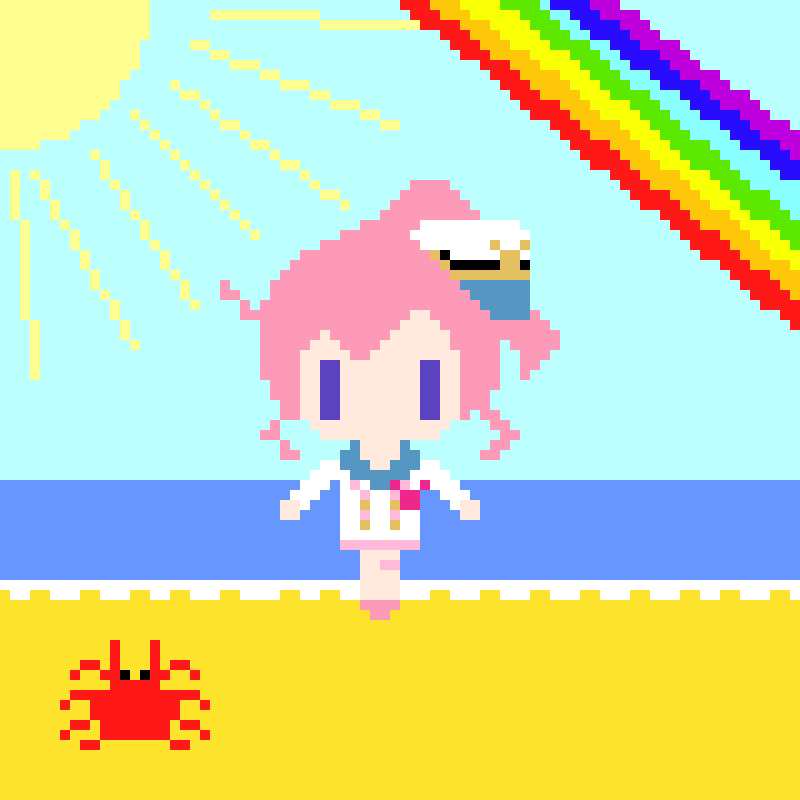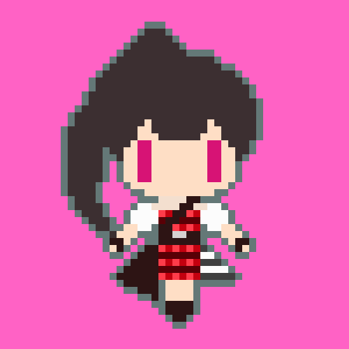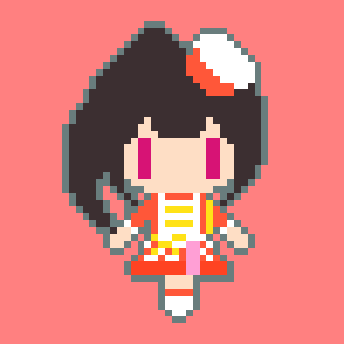 ドットを細かくするとこんな感じ。 ポニテがストレートなので、描きなおさないといけないやつ。 (この衣装だとウェーブかけてるはず・・・。) #ココ・シャベル