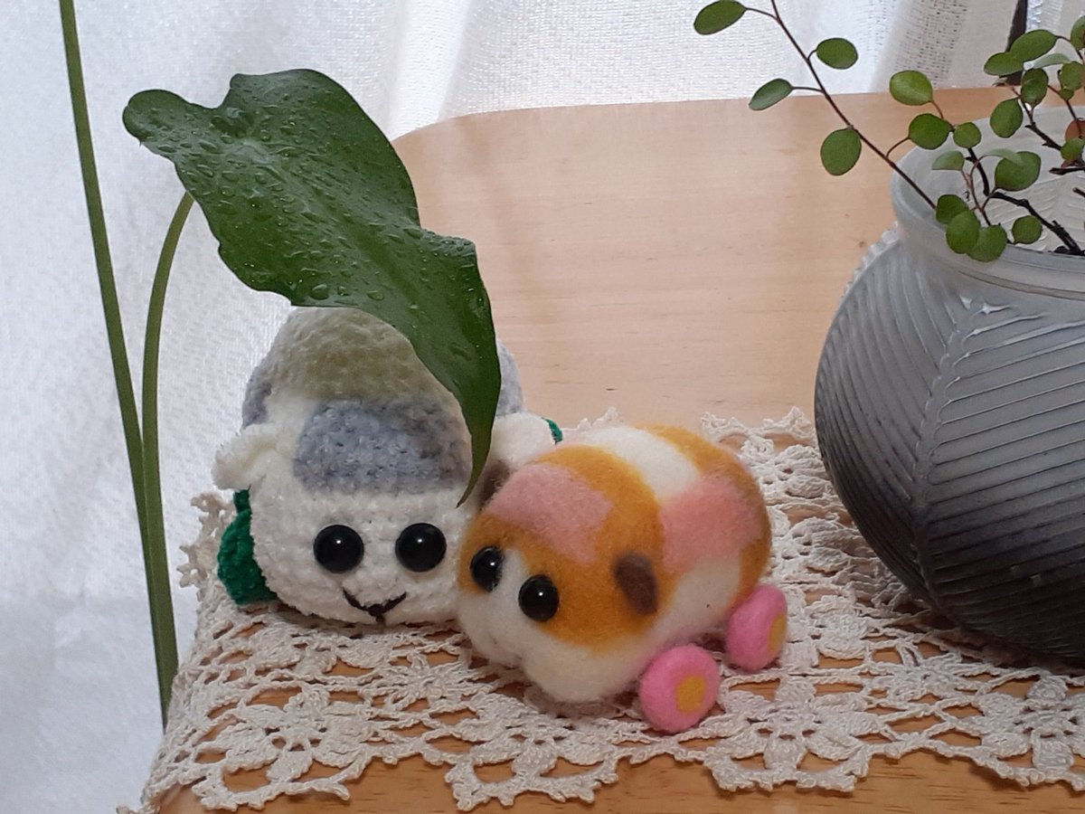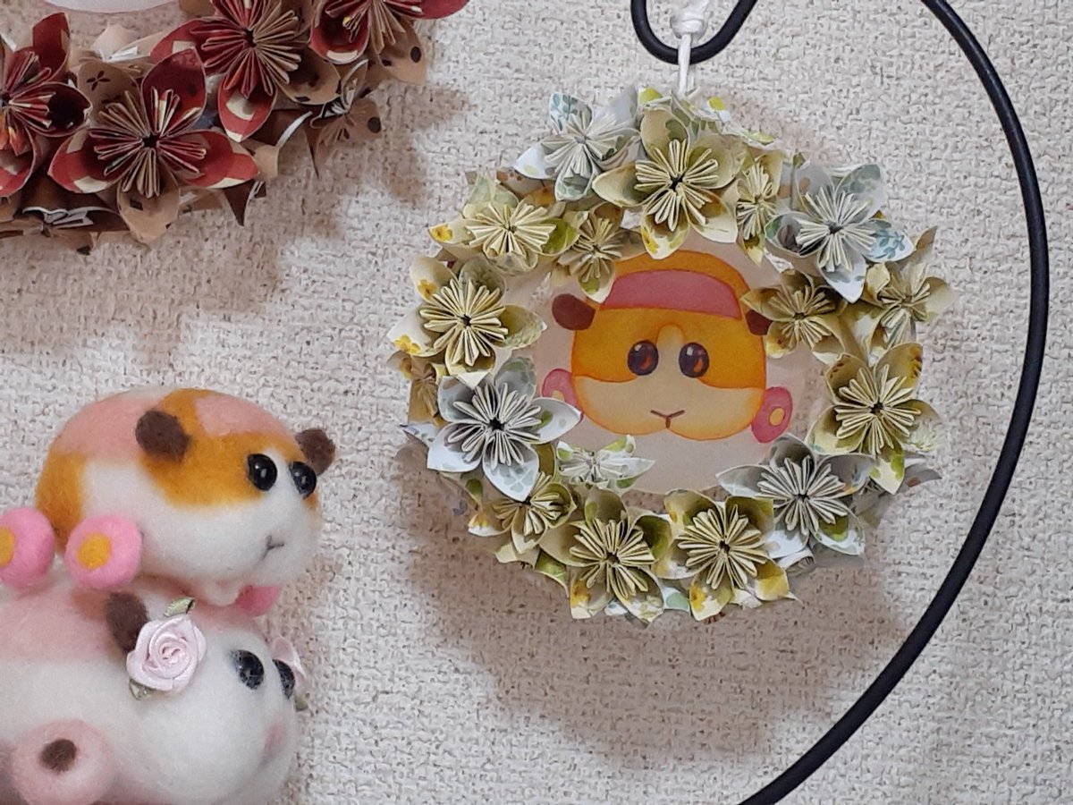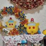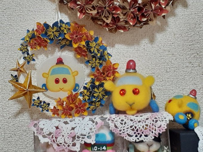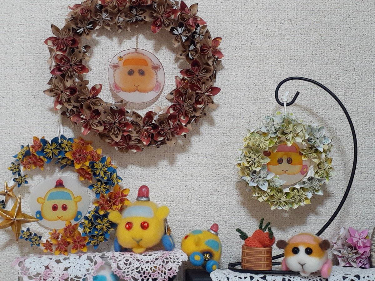 ん、なに、パトモル君?ポテトリースと私を交互に見て、なにか言いたそう? え?ポリスリースも作ってほしいって?黄色と黒の花を並べて🚧キープアウトなリースを? ん~…、さすがに今は折り紙に飽きてるから、すぐには取りかかれないけど、いつか、そのうちに、ね😅 #モルカーファンアート