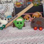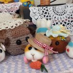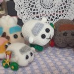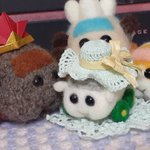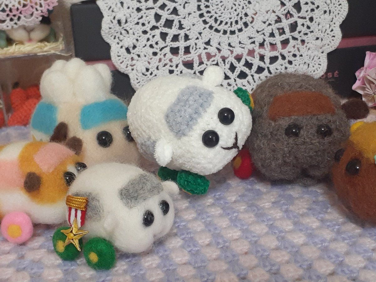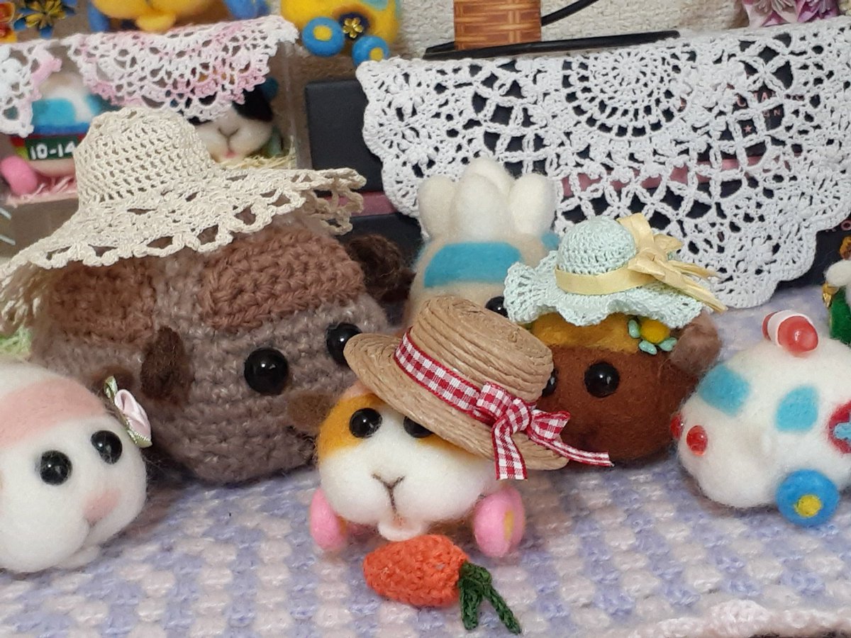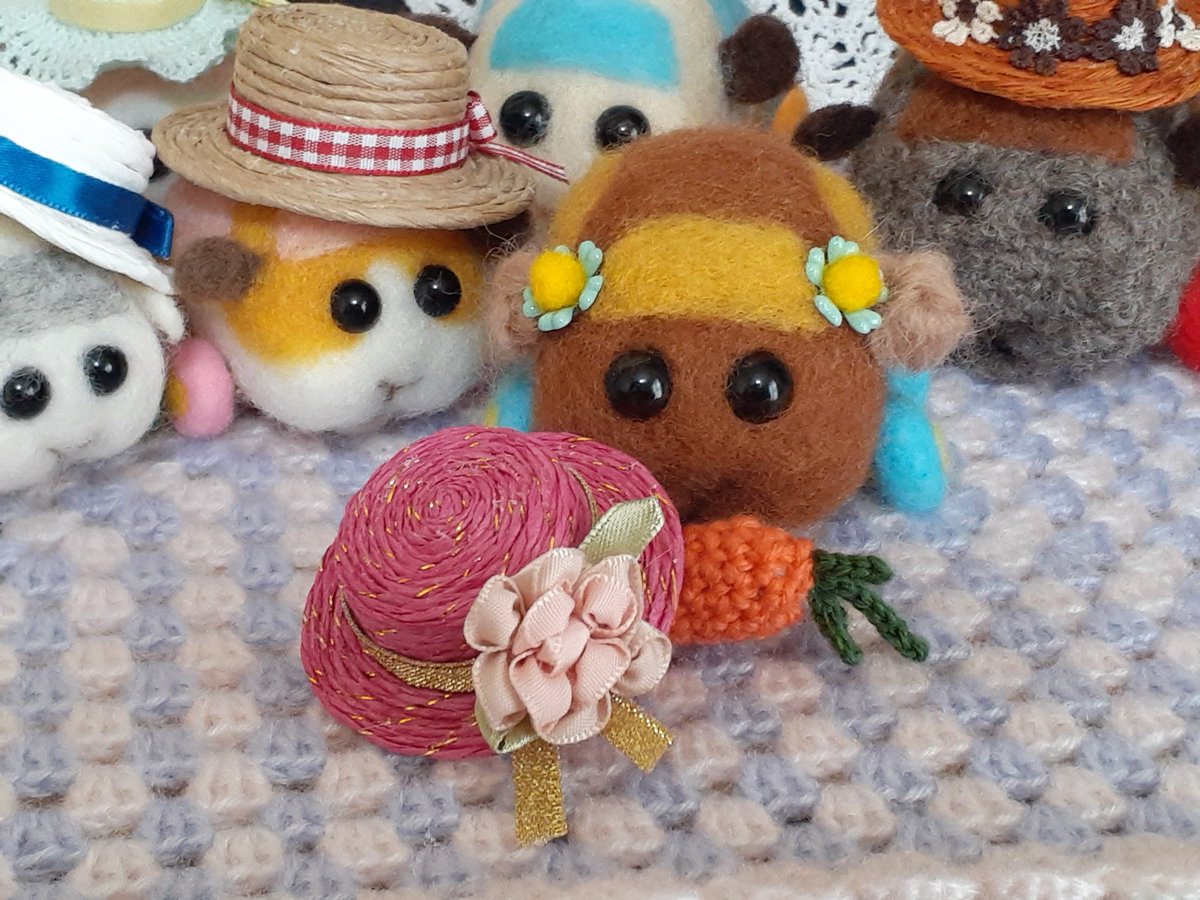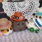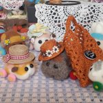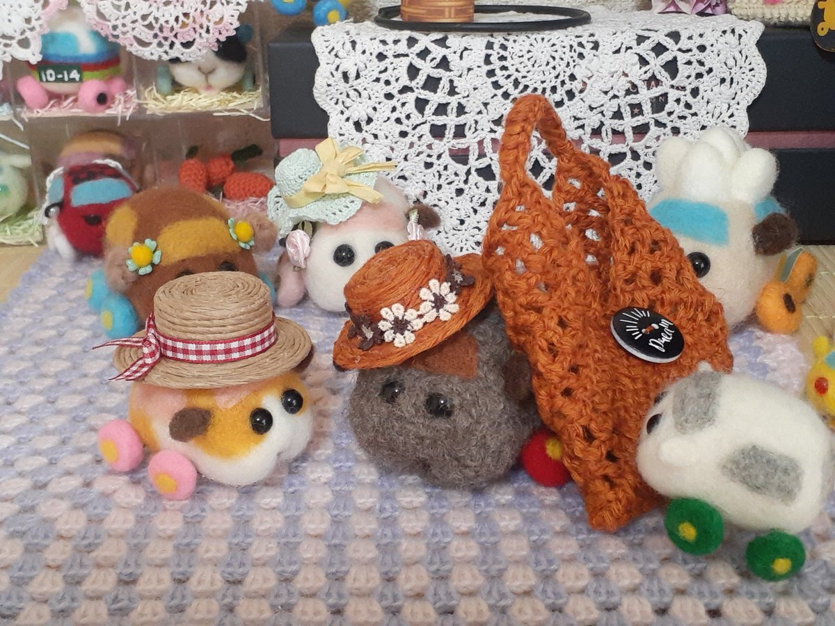 女の子プイさんのために若葉色の麦わら風帽子を編んでみた。 で、ふと思いついてシロモちゃんにかぶってもらったら…、おお、柏餅が完成してしまった?(o゚Д゚ノ)ノ みんなにクンクン匂いかがれて困り顔のシロモちゃんです~☺️ #モルカーファンアート