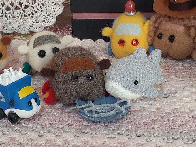あみぐるみシャーク完成!🦈 サメさんとテディ、悪食仲間だったのね(^w^) で、編み物中に出た糸屑をごはんだと認識した2人?がパクンする前に、ゴミ収集プイさんがすばやく糸屑を回収していきました☺️ 名残惜しそうな悪食ーズ😅 #モルカーファンアート