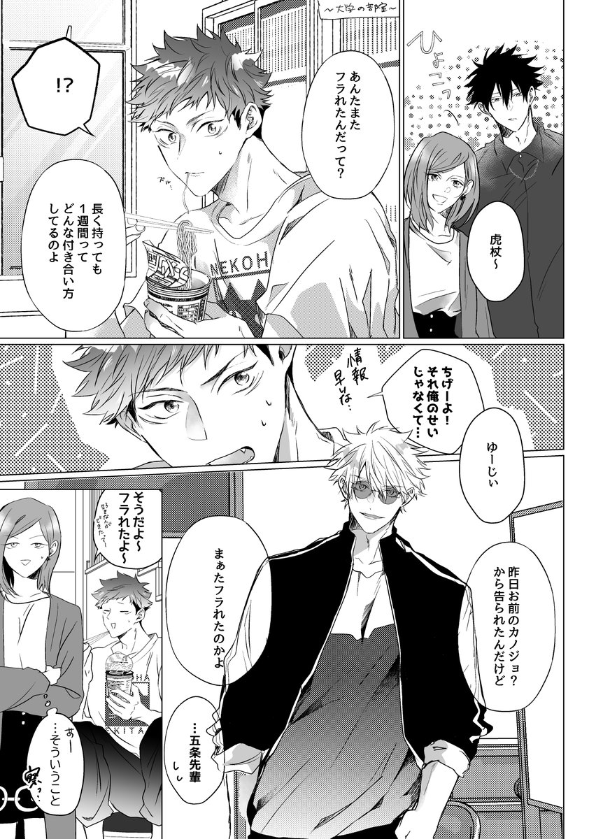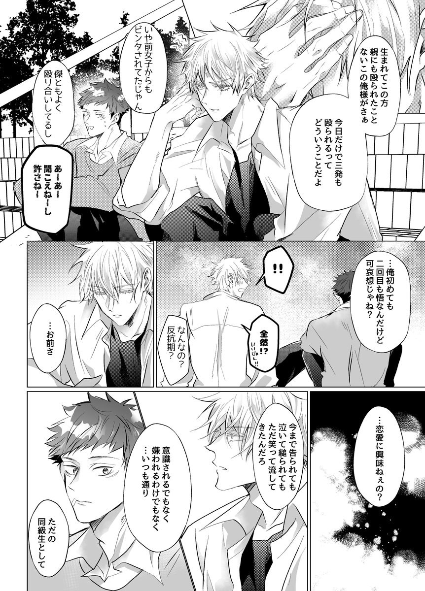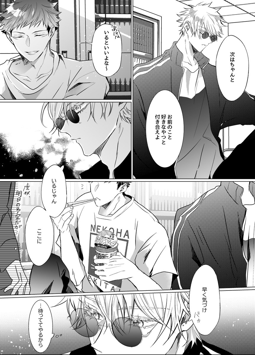 8/20五悠新刊サンプル 最強虎三人が同級生(not呪専)で恋愛・友情に忙しく青春してるだけの本です。全年齢 再録分71P+描きおろしが40-60P(まだ未定) 恋愛のCPとしては五悠のみですが友情夏虎が多分に含まれます (サンプルは描きおろしより)