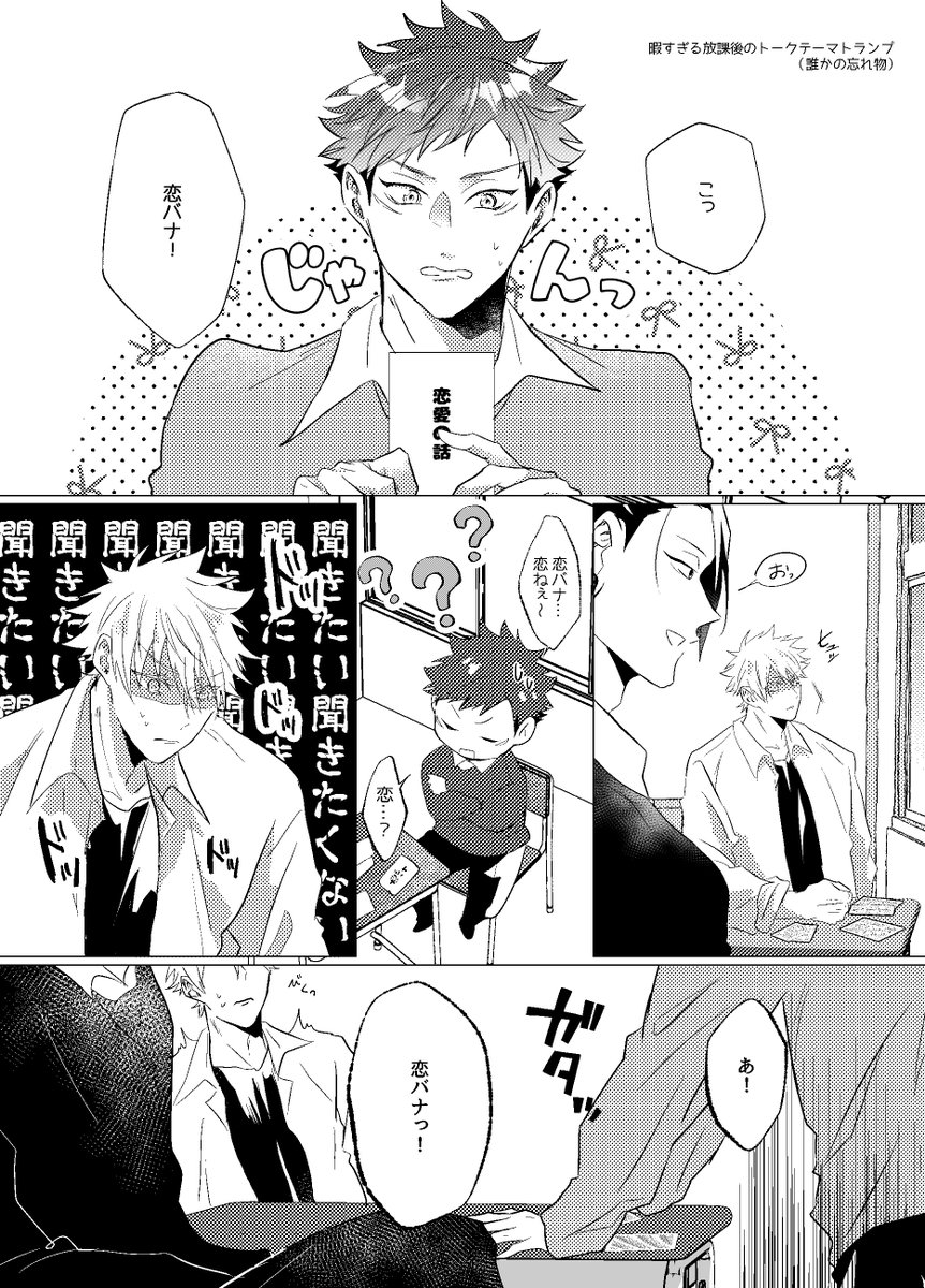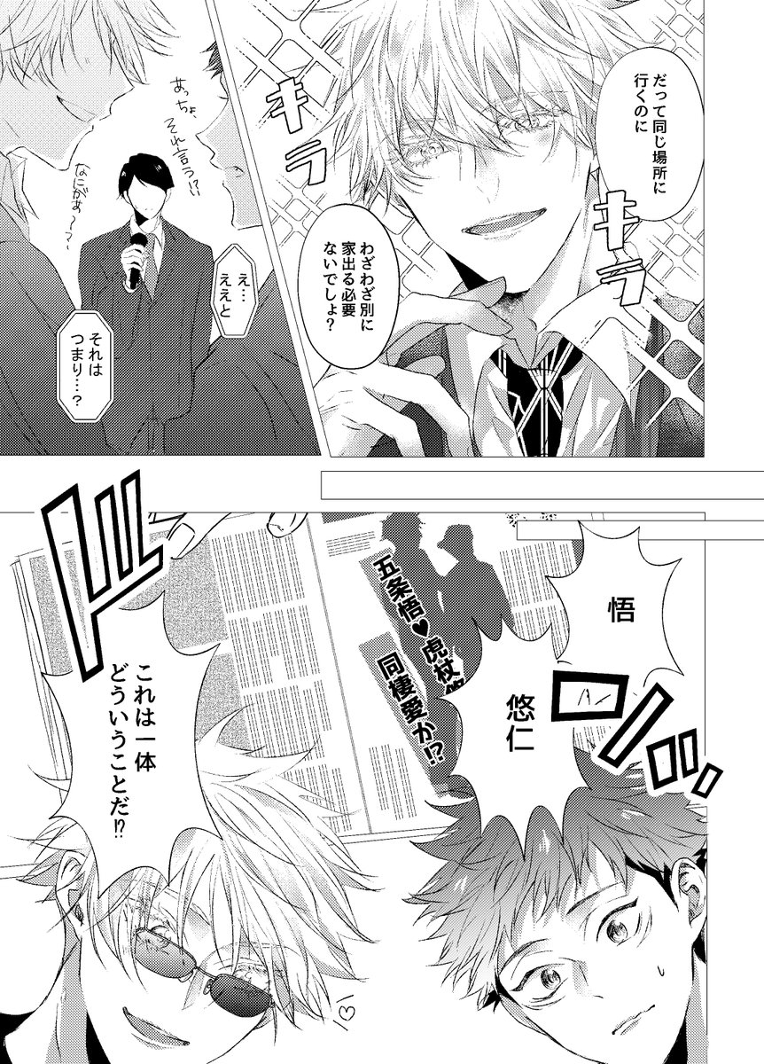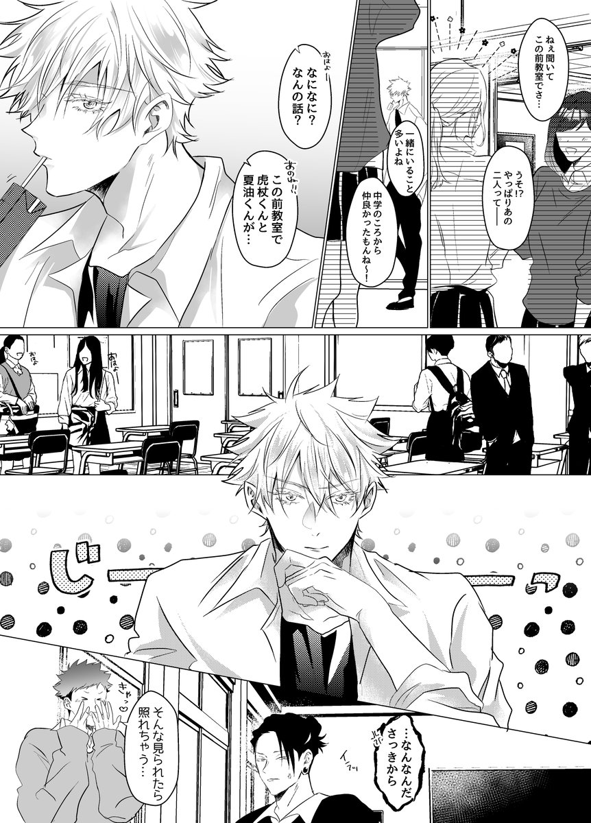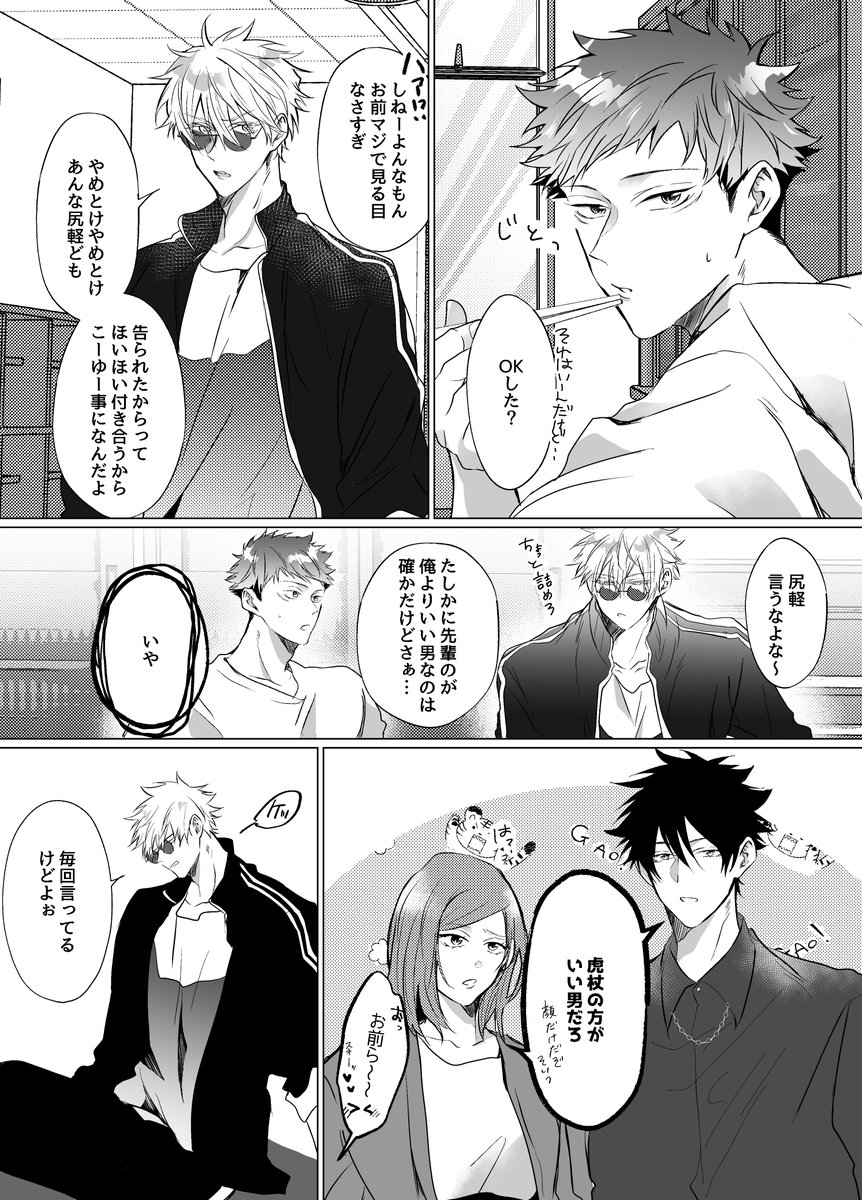 8/20五悠新刊サンプル 最強虎三人が同級生(not呪専)で恋愛・友情に忙しく青春してるだけの本です。全年齢 再録分71P+描きおろしが40-60P(まだ未定) 恋愛のCPとしては五悠のみですが友情夏虎が多分に含まれます (サンプルは描きおろしより)