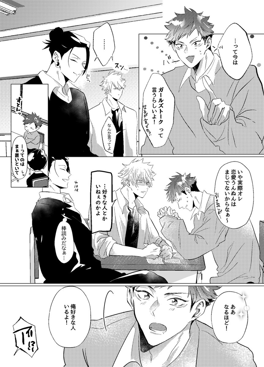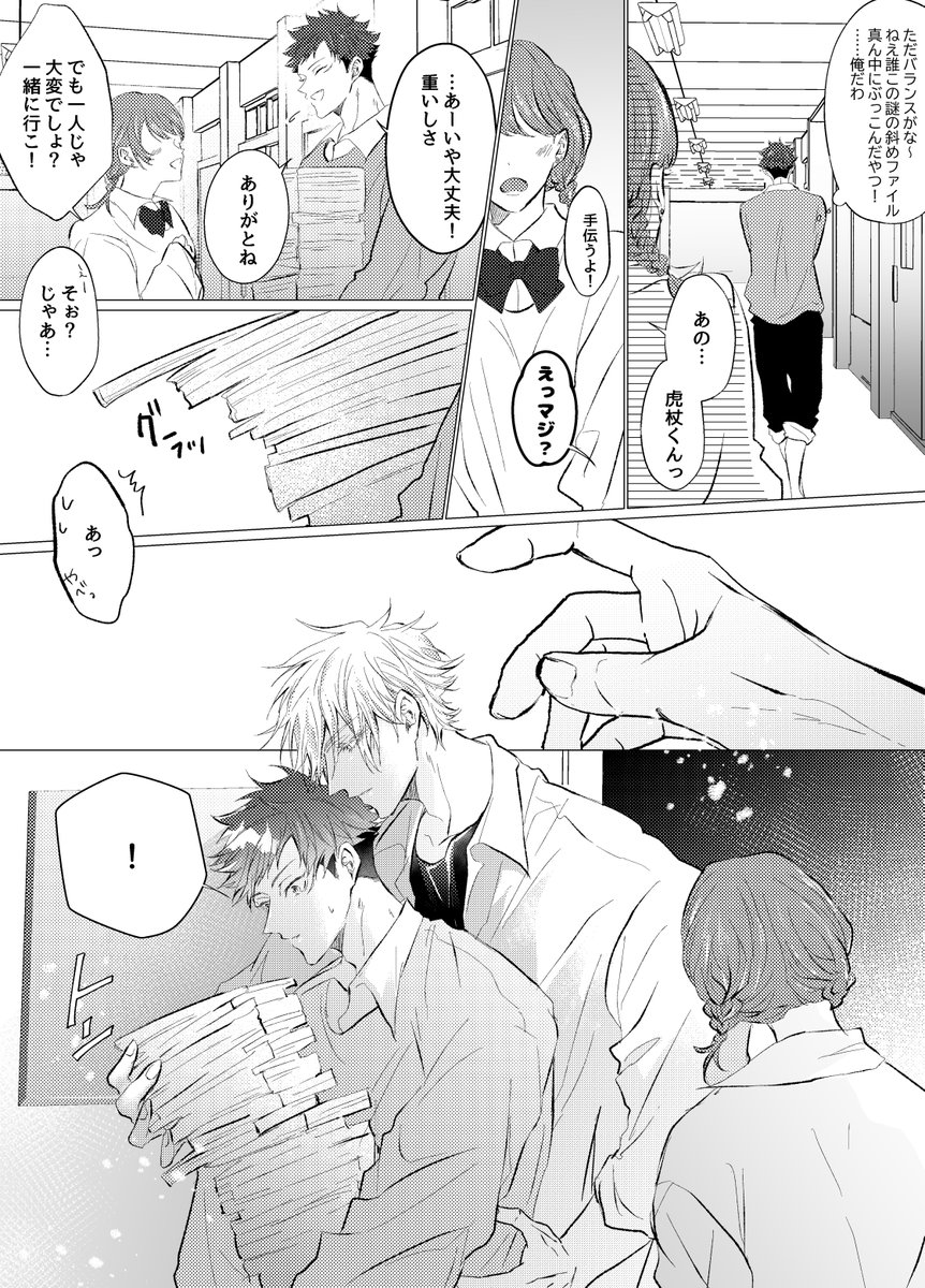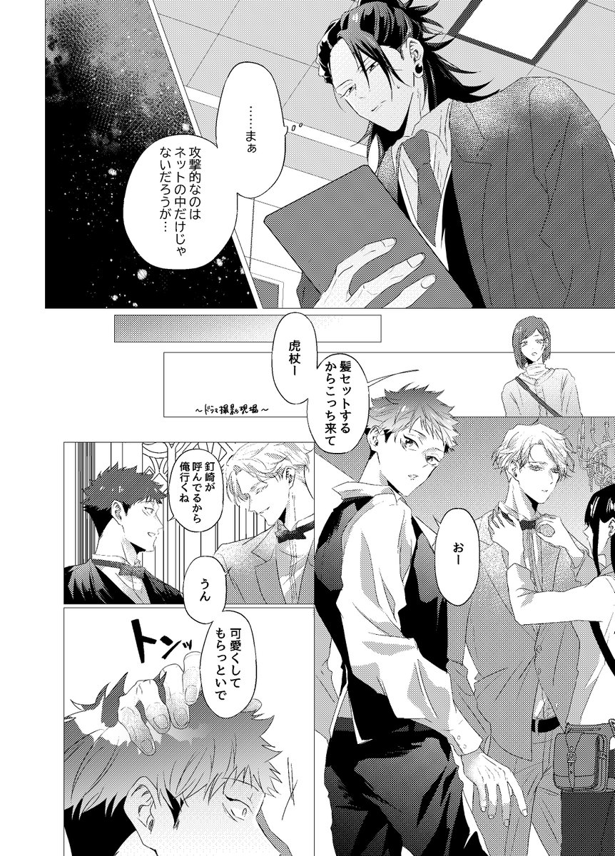 15 185 8/20五悠新刊サンプル 最強虎三人が同級生(not呪専)で恋愛・友情に忙しく青春してるだけの本です。全年齢 再録分71P+描きおろしが40-60P(まだ未定) 恋愛のCPとしては五悠のみですが友情夏虎が多分に含まれます (サンプルは描きおろしより) 23/07/28 19:29