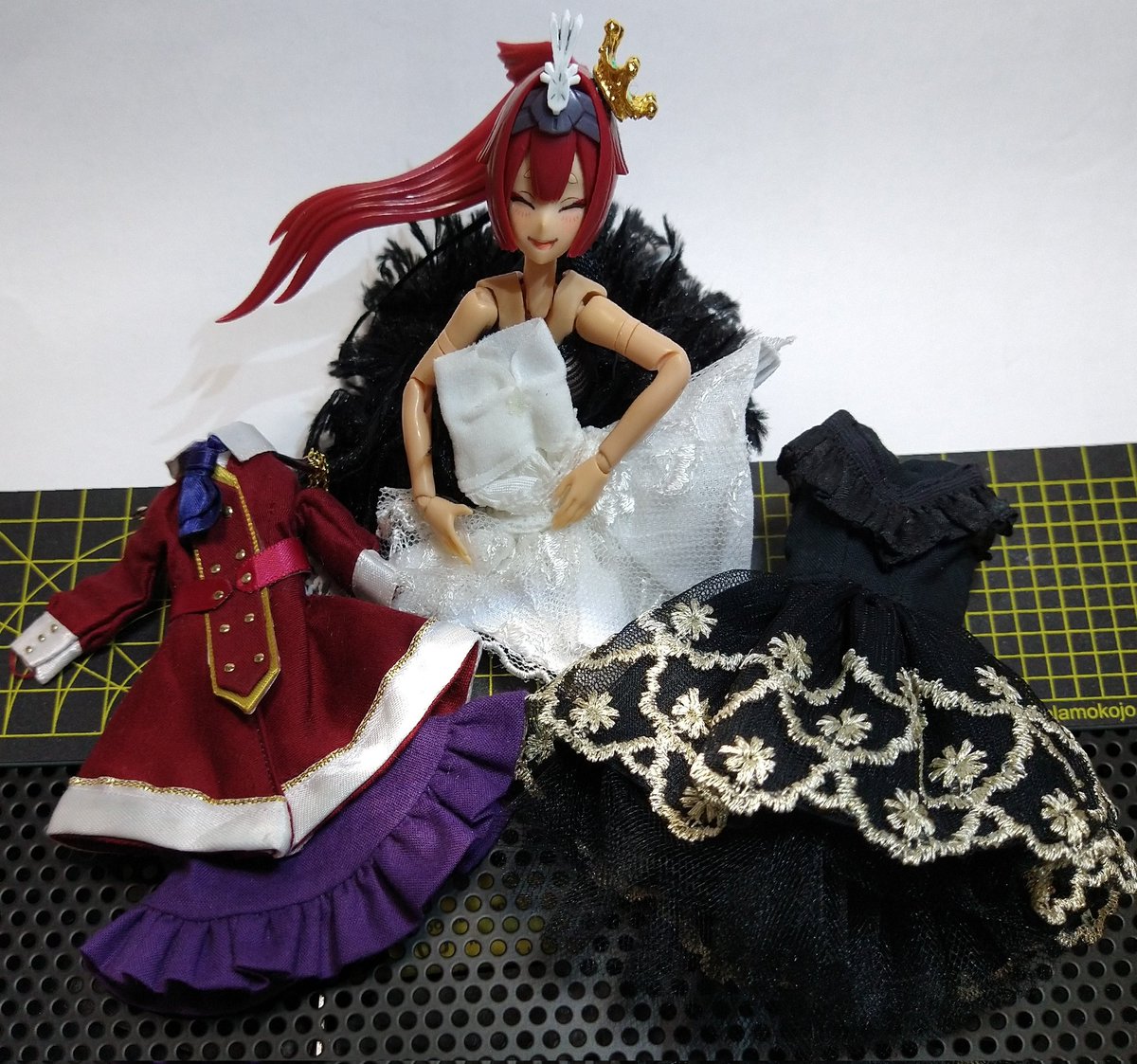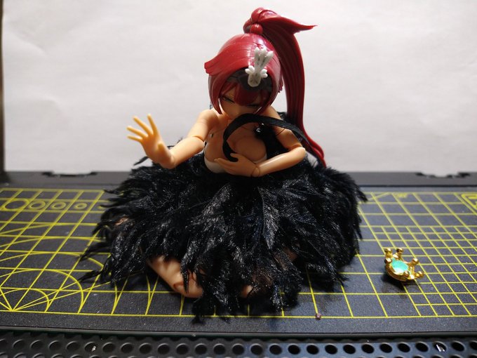 や)どうでした?お気に召すものはありましたか? 玉)ええ、どれもとても素敵だったわ 玉)でも、1番は初めて買ってくれたこれよ。白鳥の湖っぽくて素敵だって言ってくれたもの。(黒鳥は悪役なの知ってるけどね) 着ない訳じゃないけど、皆にも着せてあげて? や)玉藻様… #いろしか #メガミデバイス
