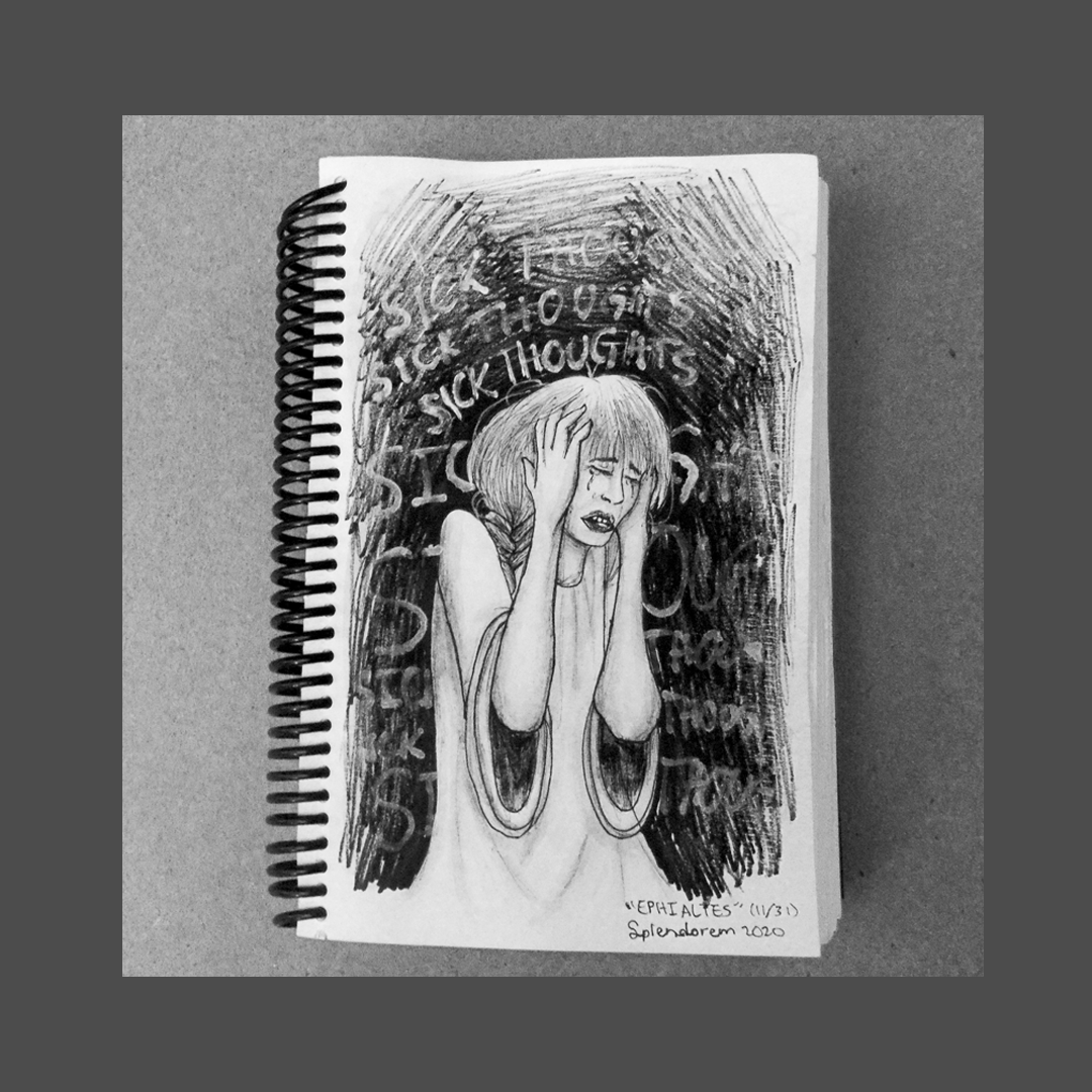 "Ephialtes" Día 11 del #obscuretober2020 Una pesadilla. Me inspiré en la canción "Sick Thoughts" de @lewisblissett , me encanta <3 #Artober2020 #artober #inktober #inktober2020 #inkdrawing #myart #artistsontwitter #obscuretober #blackandwhite