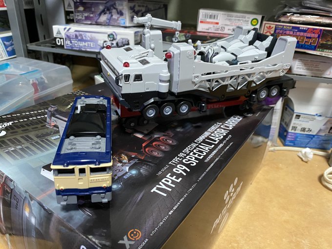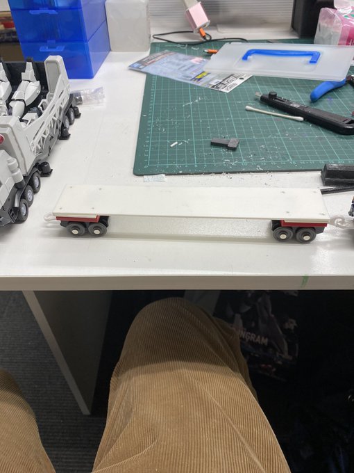 え〜レイバーキャリア鉄道輸送計画ですが土台完成と仮組まで来ました。あとは固定を考えるのとなんか走らせれればいいなっと #パトレイバー模型部