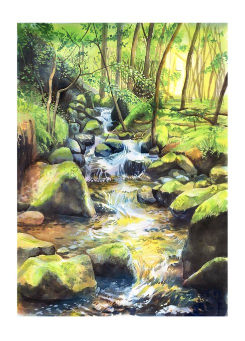 “源にさかのぼる” 前に描いたものを涼やかさとひかりをより感じるように書き足しました◎ ポートフォリオにたくさん入ってる緑と水たちの中から 暑いですね! ちょっとでも涼しくなれますように🌿💠✨ #イラスト #illustrationart #Illustration #涼