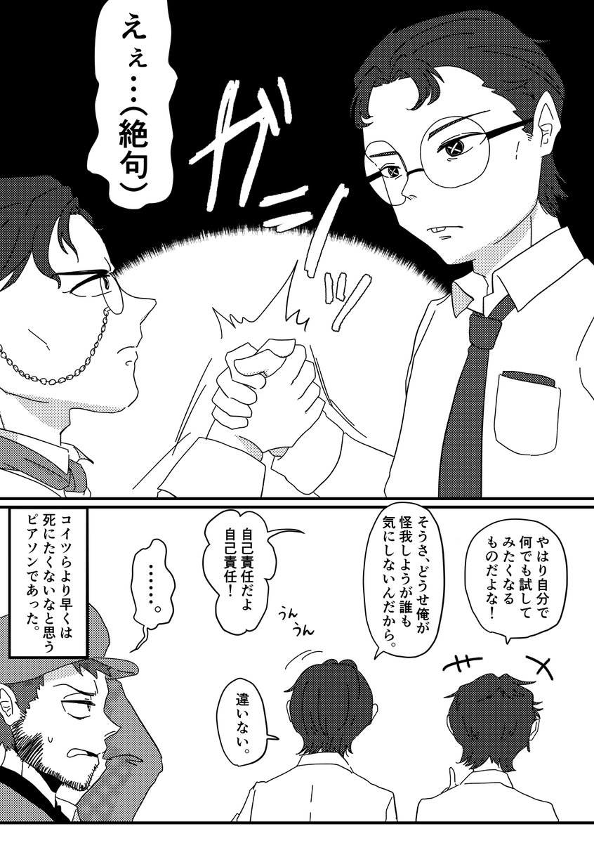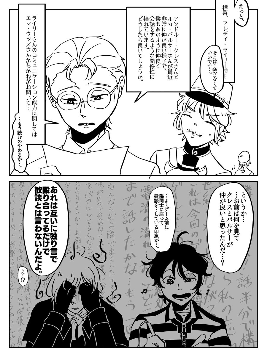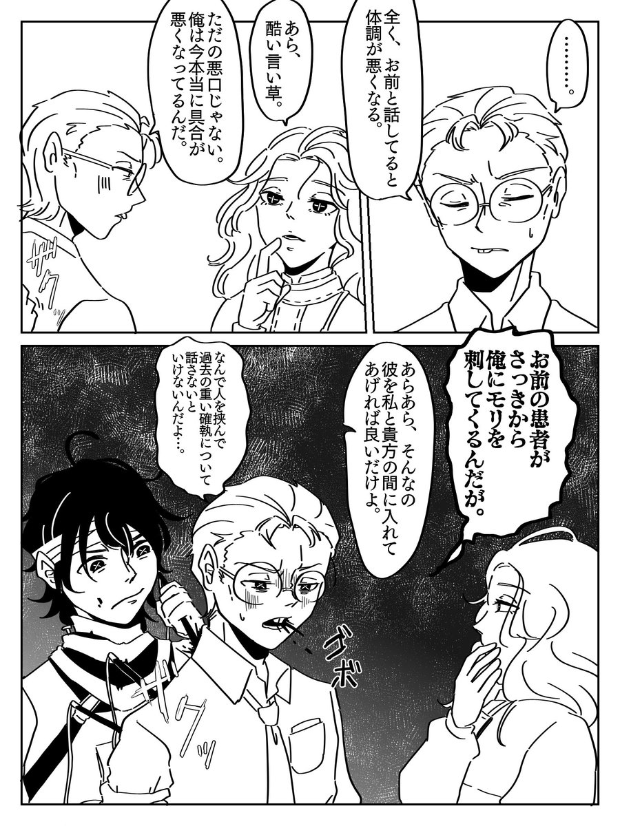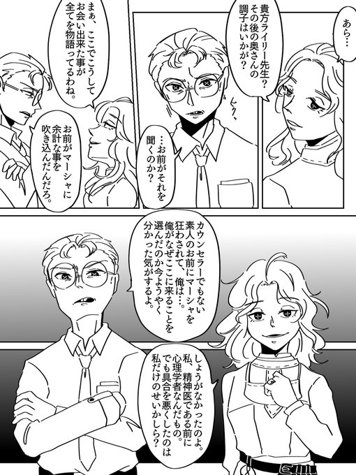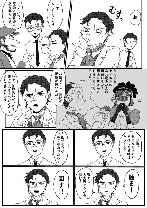メスマー先生とライリーさん。 弁護士の二年目の誕生日手紙に登場したあのメスマーなのか、気になり過ぎて荘園で出会った二人の捏造漫画を描きました。心理学者患者ペア怖すぎンゴ。 #第五人格 #IdentityV #第五人格イラスト