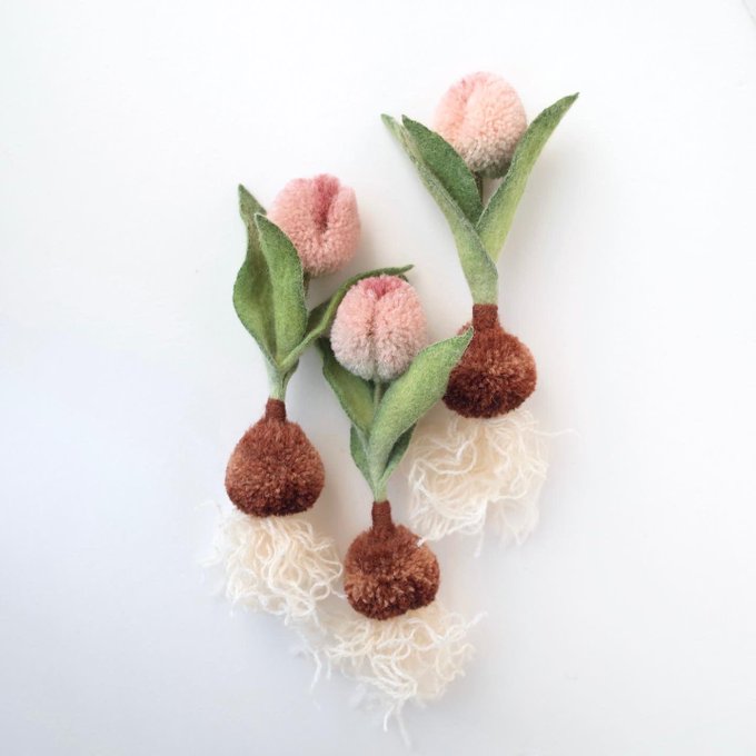 あたらしい生活が始まるみなさん、 おめでとうございます🌷 ずっとつくりたかったものを。 花と球根と根をぽんぽんで、葉はフェルトを染色して成形しました。 Tulipompom🌷 I wish you a peaceful spring. #trikotri #trikotripompom