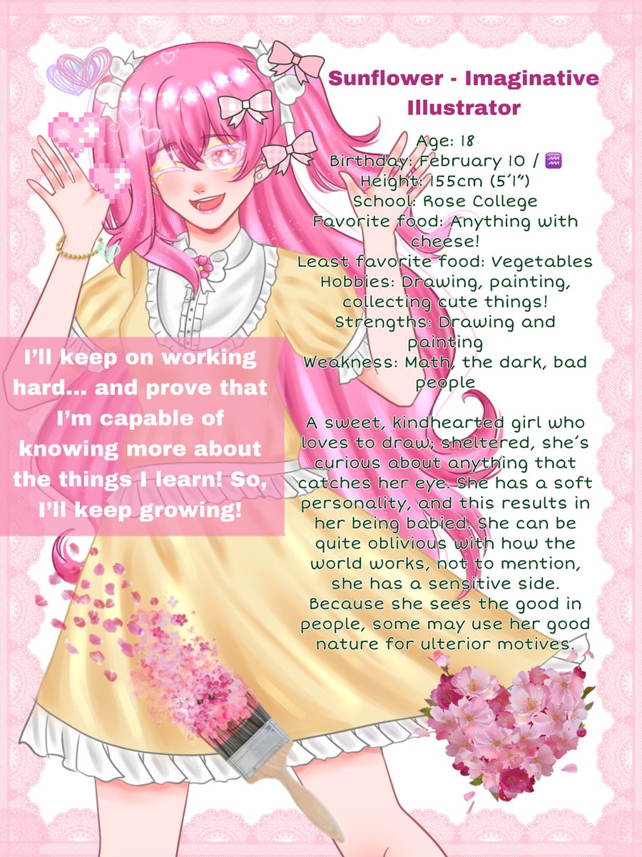 Sunflower’s character bio! Will you keep an eye on this pink-haired girl? 😳💗#oc #originalcharacter #artistsontwitter