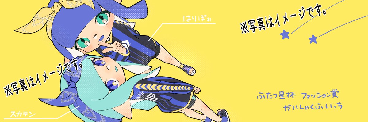 9 34 ふたつ星杯(@ 2stars_cup )ファッション賞ヘッダーを描かせていただきました!! 黄色と青系の色で統一してあるコーデが可愛くて選ばせていただきました☺️✨ 23/01/17 19:02