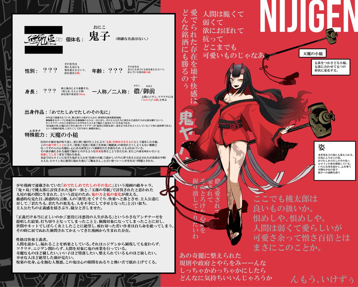 こちらの企画【@egakinam 】に全日本無免許作家連合に参加させていただきます。 鬼子(おにこ)です。 よろしくおねがいします。 #エガキナマキナ_CS #エガキナマキナ_ニジゲン #エガキナマキナ_無免連