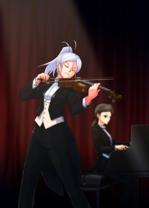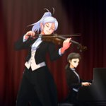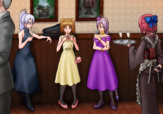 お題箱:お酒が入ってほろ酔い気分の路地裏同盟が見てみたいです 🥂遠野家のパーティーでの演奏を依頼され・・・という設定で描いてみました。 #odaibako_true_apocrypha odaibako.net/detail/request… #リーズバイフェ #弓塚さつき #シオン・エルトナム・アトラシア #メルブラ #琥珀さん #月姫 #型月