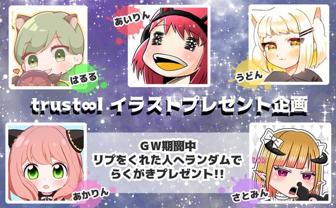 ✨𝘁𝗿𝘂𝘀𝘁∞𝗜 プレゼント企画✨ 参加方法✦ 𝙵𝚘𝚕𝚕𝚘𝚠 (@trust_illust)& 𝚁𝚃 当選人数✦1人~ 参加期間✦GW中 🎠𓈒𓂂リプに描いて欲しいイラストの詳細 🎡 𓈒𓂂ランダムで絵師が落書きプレゼント 🎪 𓈒𓂂絵師や絵柄はおまかせになります #アイコン企画 #アイコン無償企画 #夢絵企画