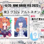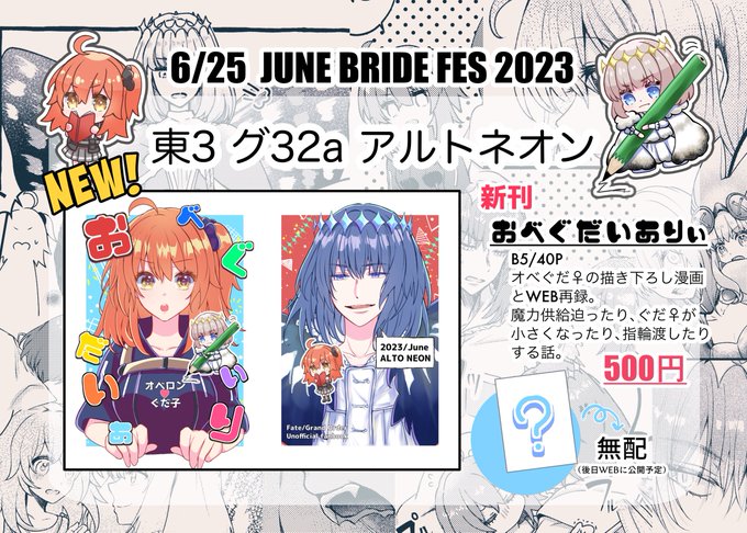 6/25 JUNE BRIDE FES.2023 お品書きです📝 【東3 グ32a】アルトネオン オベぐだ♀本と無配ペーパー持っていきます! 当日はよろしくお願いします☺️🙏 ◯新刊サンプル→ pixiv.net/artworks/10886… ◯🐯通販→ ecs.toranoana.jp/joshi/ec/item/…