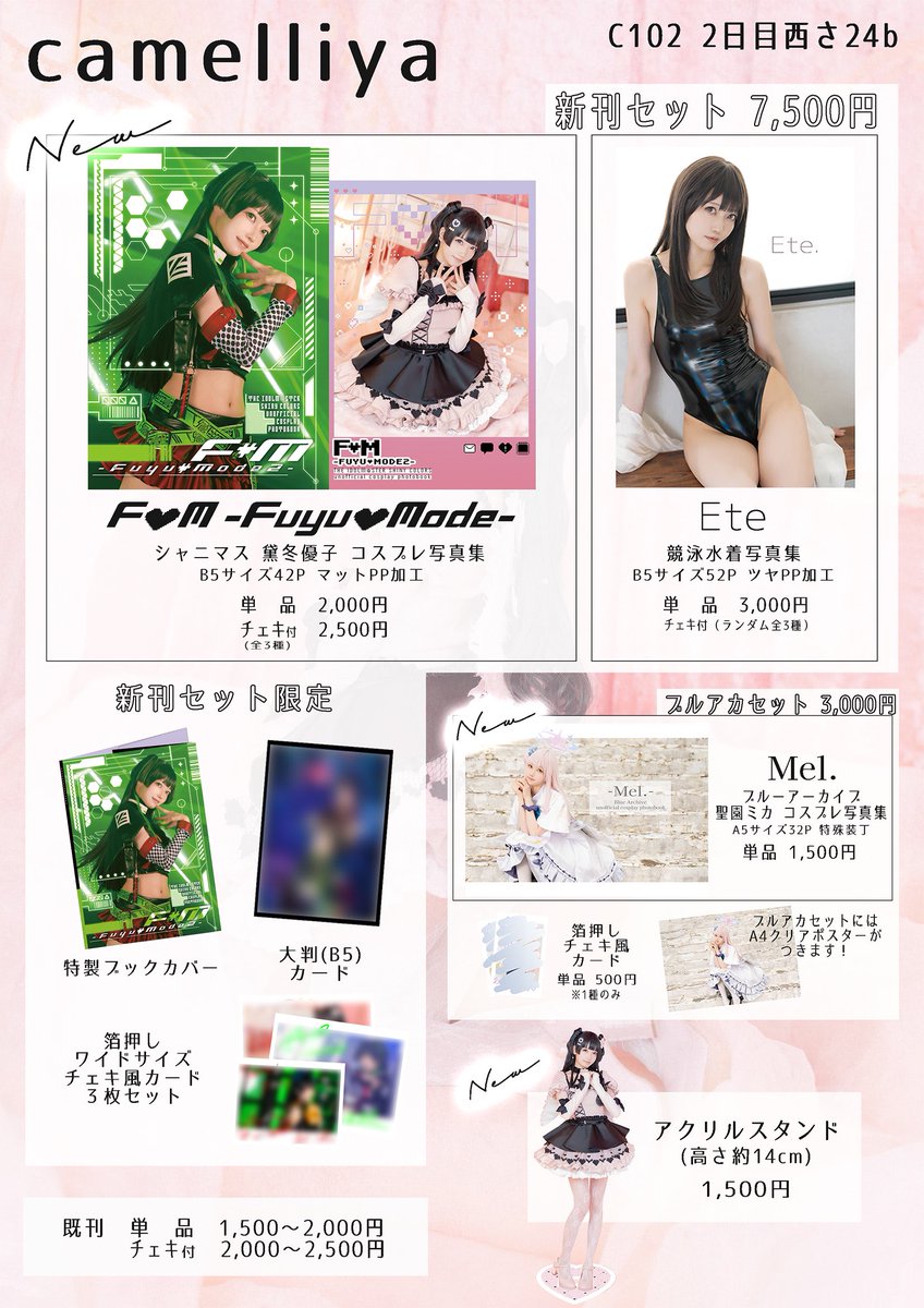 #C102 お品書き🏖 1日目はブルアカ島、2日目はコスプレ島での参加です! 2日目は新刊セットもございます❣️ 冬優子写真集は3着、ミカ写真集は2着、競泳水着写真集は4着収録です✨ 1日目(土)西ほ22a cosmic ailes、2日目(日)西さ24b camelliyaにてお待ちしております🎀 #C102お品書き