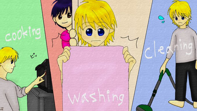 5月25日は主婦休みの日だそうです!✨ いつも家事🏡をしている苺ちゃん🍓にかわって飛鳥くん🛥️が家事をしているところを描きました🎨 飛鳥くん頑張ってー📣 #あすかなアート