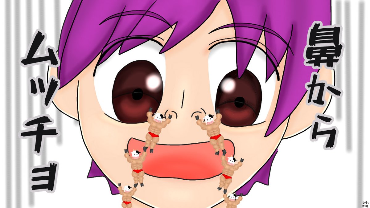 苺ちゃん🍓飛鳥くん🛳 3月25日は嘉門達夫さんの誕生日だそうです🎂おめでとうございます❕ 前に苺ちゃんが鼻から牛乳を歌っていたことを思い出して、鼻からムッチョを描いてみました🎨🐮 苺ちゃんの鼻から生まれるムッチョさん🙂 #あすかなアート