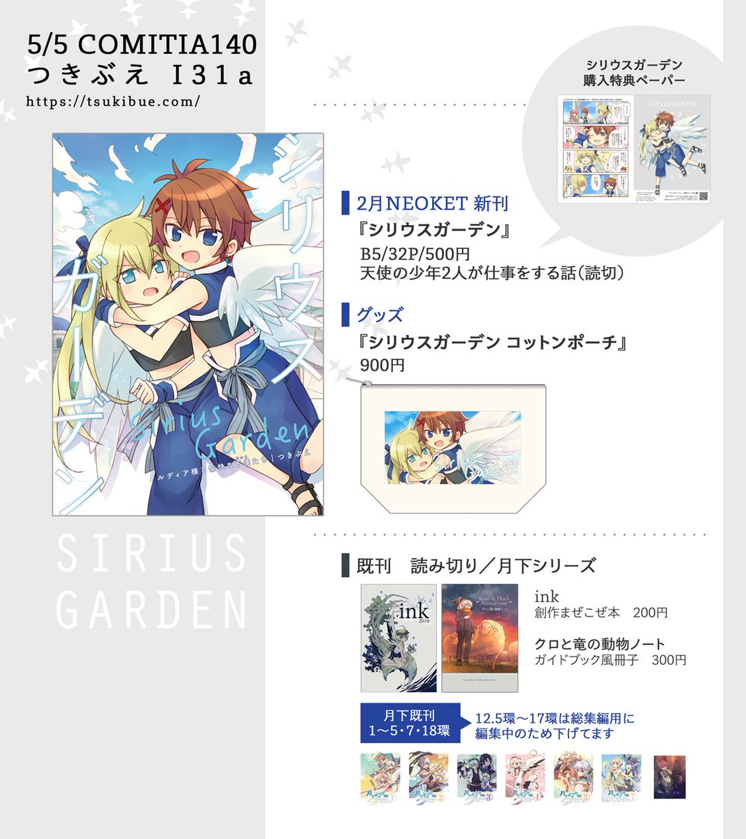 5/5 #COMITIA140 つきぶえ【I31a】で参加します!2月新刊『シリウスガーデン』がティア初頒布 当日合わせの新作はないので通販してくださった方には申し訳ないのですがお立ち寄りいただけたらうれしいです…!✨FANBOXサポーターさんにはコピー本をお渡しできる予定なのでスペースでお伝えください〜!