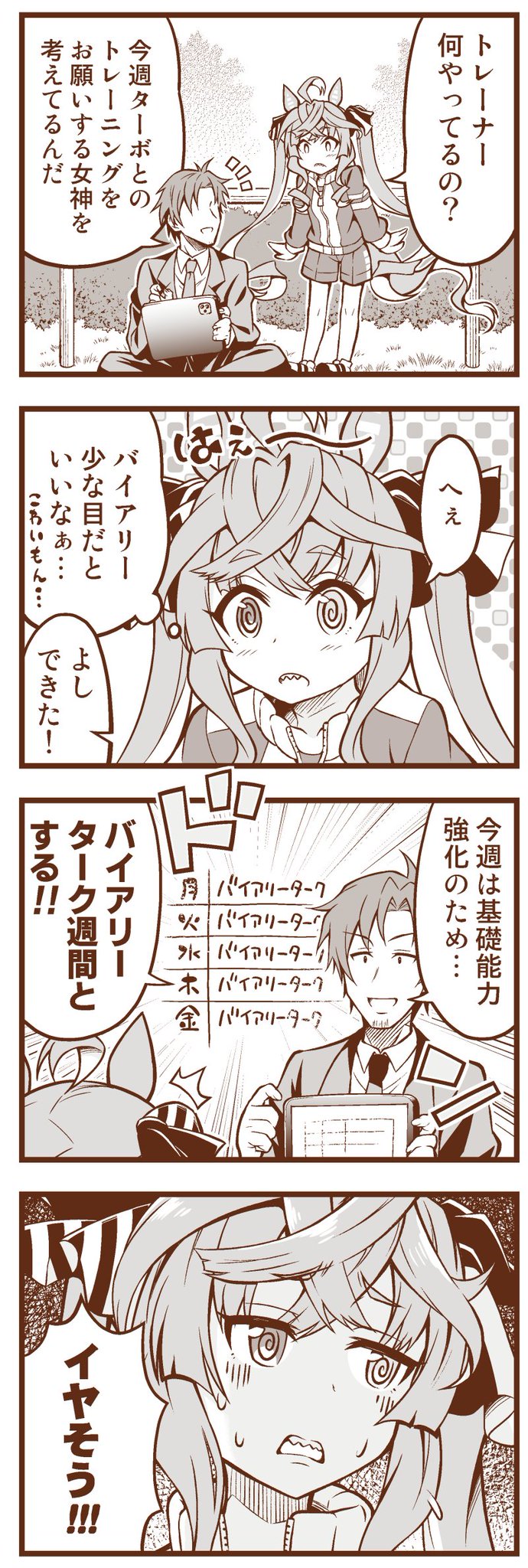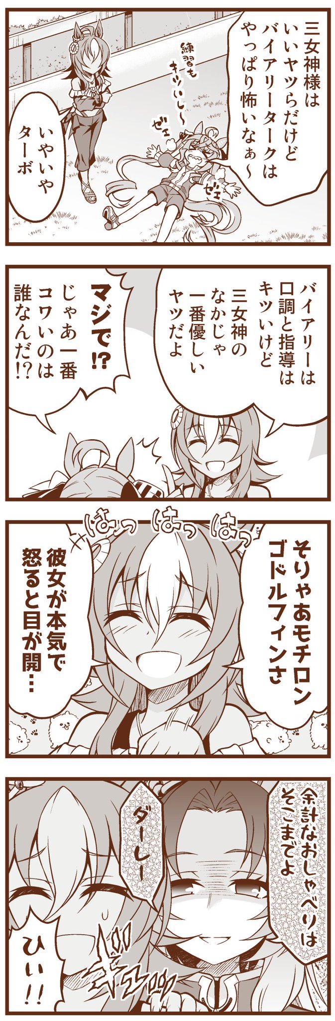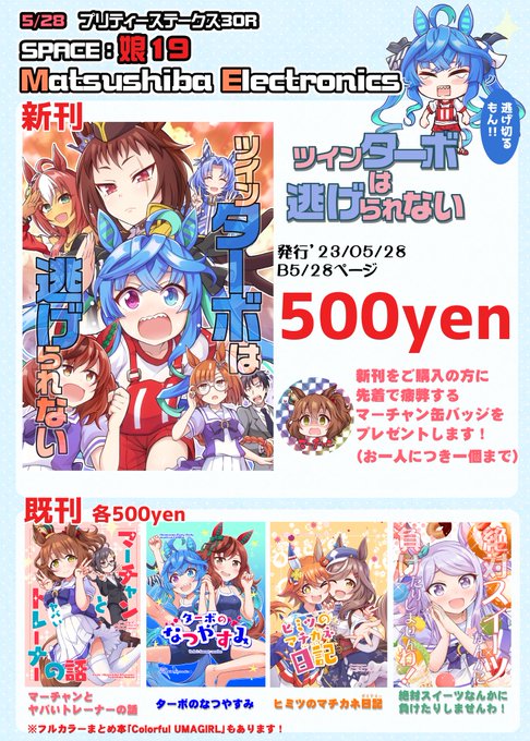 5/28プリステ新刊はツインターボと三女神のほのぼの特訓コメディです 頒布スペースは【娘-19 Matsushiba Electronics】委託はメロンブックスさんです よろしくお願いしますっ! 🍈melonbooks.co.jp/detail/detail.…