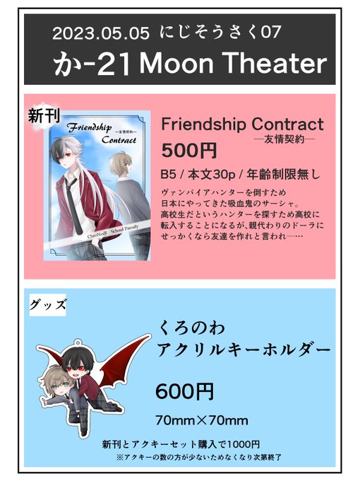4 3 改めまして #にじそうさく07 のご案内です 【か-21】Moon Theater くろのわ学パロの新刊1冊とアクキー1種を揃えて お待ちしております…! このツイートに当日の販売状況等ツリーで繋げますのでご入用の方は適宜確認お願いします ※番号をお配りするネプリ用のイラストは後日アップします 23/05/04 19:04