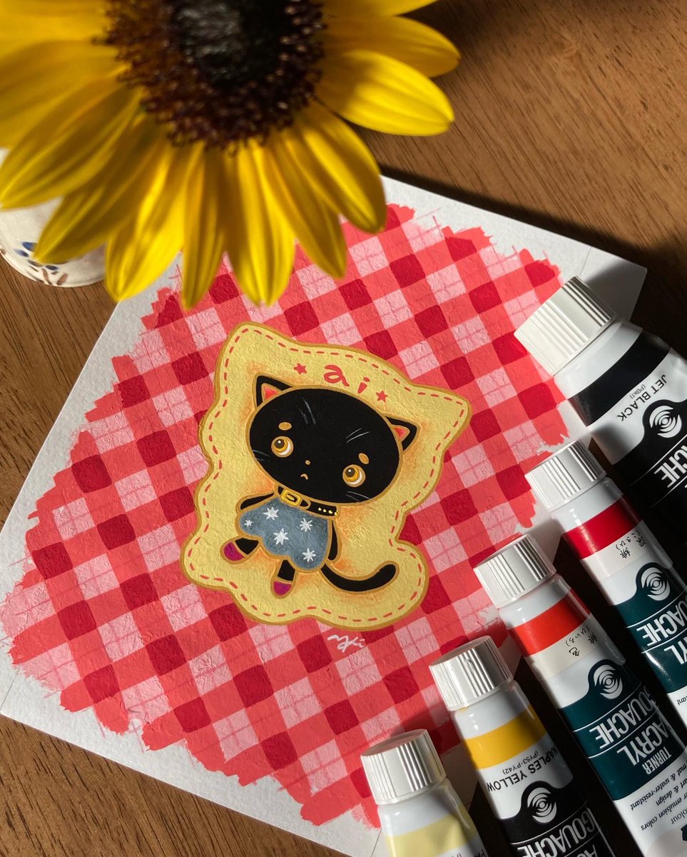 ペット似顔絵のご依頼いただきました✨ 黒猫のあいちゃん🐾❣️ ツンデレで、首輪がいつも後ろ前になっちゃうあいちゃん🥺可愛い…🌟 ありがとうございました!! #イラスト #illustration #ペット似顔絵 #アクリルガッシュ