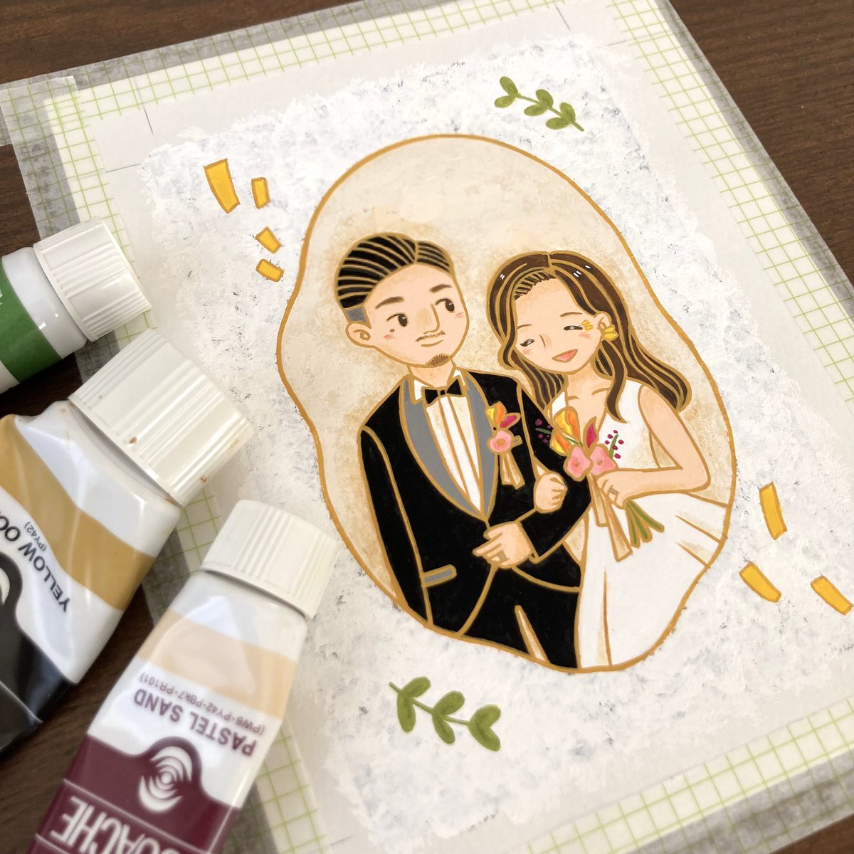 1 15 お友達の結婚祝いにとウェディングイラストのご依頼いただきました💖 (掲載許可いただいたので、名前の部分を伏せて載せています☺︎︎︎︎) ご結婚おめでとうございます💍✨️ #イラスト #アクリルガッシュ #似顔絵 23/03/07 21:00