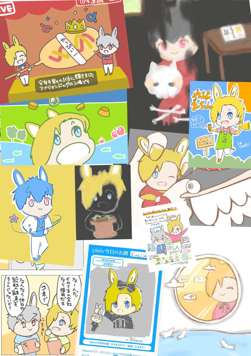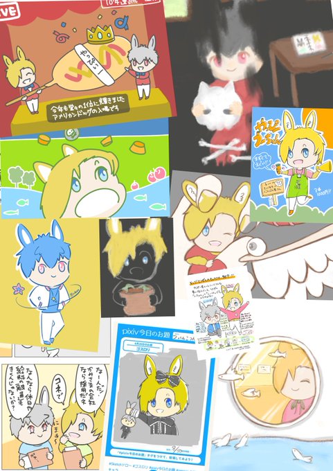 今月は季節の絵や〇〇の日、名画パロとか色々描けたと思うよ(∩´∀`)∩ヤピ~ それと念願のmimicの登場だね、右上の絵は顔mimicで身体と背景はつんで合作したの!嬉しかった #今月描いた絵を晒そう