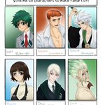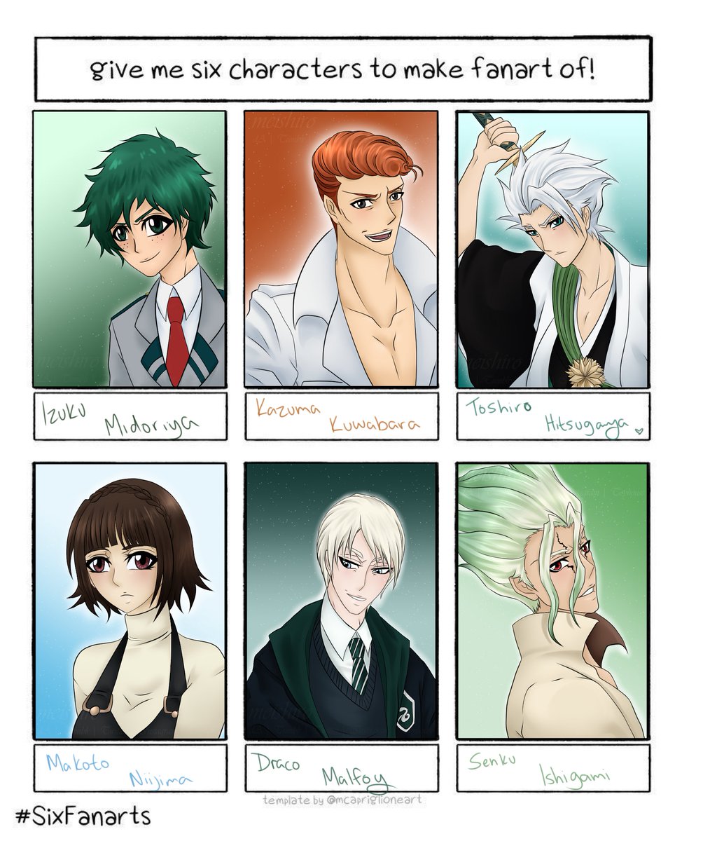 #SixFanartsChallenge #SixFanarts Ahhh I actually finished! Hope this was worth the wait c: . . . #dekumidoriya #bnha #kazumakuwabara #yyh #toshirohitsugaya #bleach #makotoniijima #persona5 #dracomalfoy #harrypotter #senkuishigami #drstone
