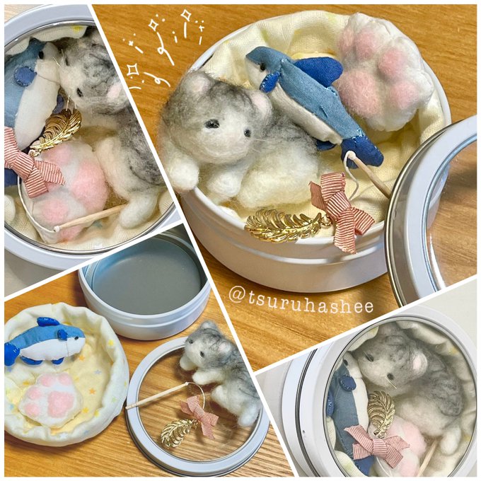 ここ数日作ってたねこちゃんの缶詰め……「ねこ缶」が完成しました✨ (お魚さんに糸屑がついてますがそっと見なかったことに……_(:3 」∠)_) #ハンドメイド #羊毛フェルト #ハンドメイド好きさんと繋がりたい
