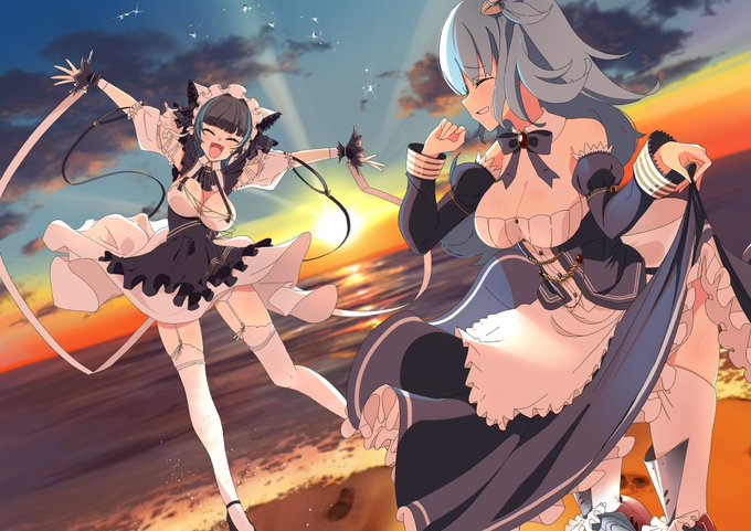 浜辺で遊ぶネプチューンとチェシャーです リクエストありがとうございました✨ #アズールレーン