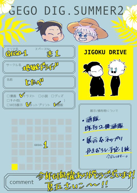 GEGO DIG.SUMMER2 今年も開催おめでとうございます👒🏖️🌻 かきおろしイラストの展示&ネプリの予定です!(今描いてます) よろしくお願いします🍧🥳 #725SUMMER2おしながき #725SUMMER2イラスト