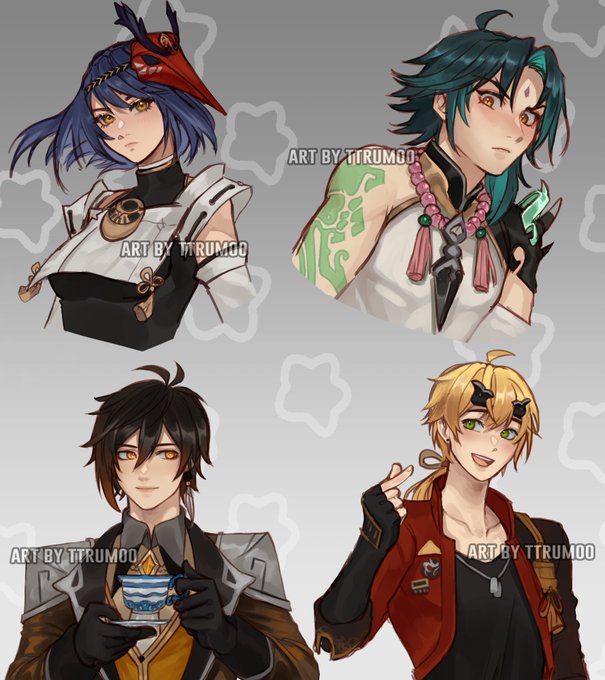 4 Genshin character requests taken yesterday from my stream! ^-^ I really like how Xiao came out <3 he's so pretty #genshintwt #genshinimpactfanart #Genshin #XIAO #kujousara #zhongli #Thoma
