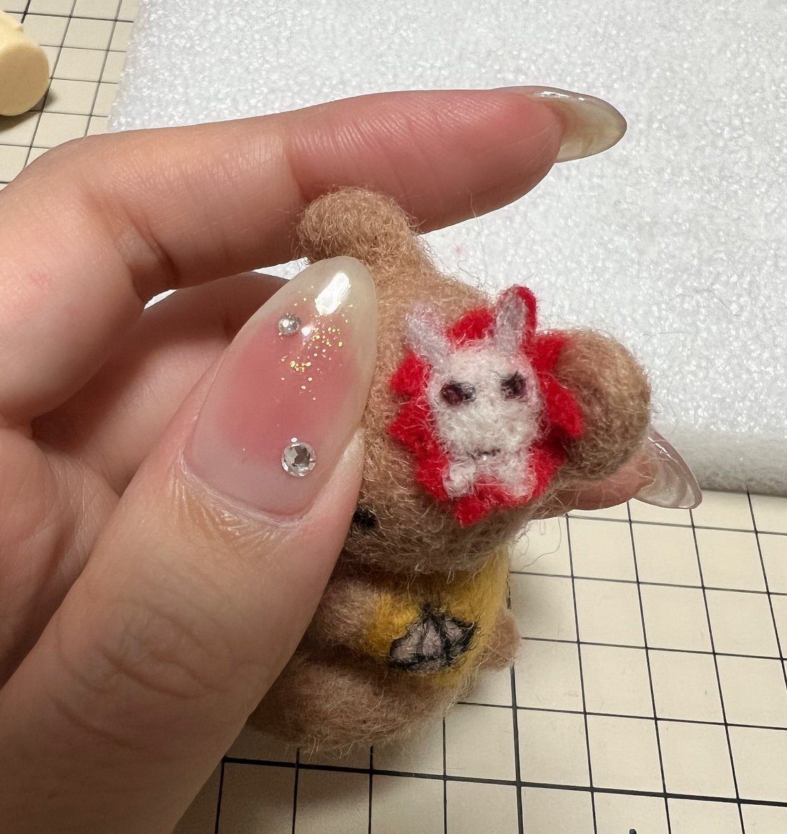 配信しながら作ってたやつ!!! 私の親指より小さいよ🫠 ネイリストさんほんとすごいなと思った あともう1つ小物作ったら完成だ! さてさて…もうお分かりだろうか😏 #羊毛フェルト