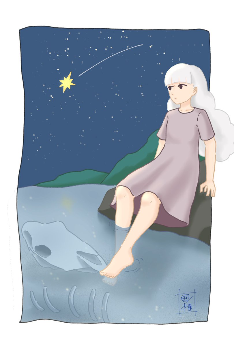 ゐ先生の創作の世界感が好きだーーーー!という思いで描きました。 湖のほとりで星を眺める女の子と…… #イラスト