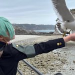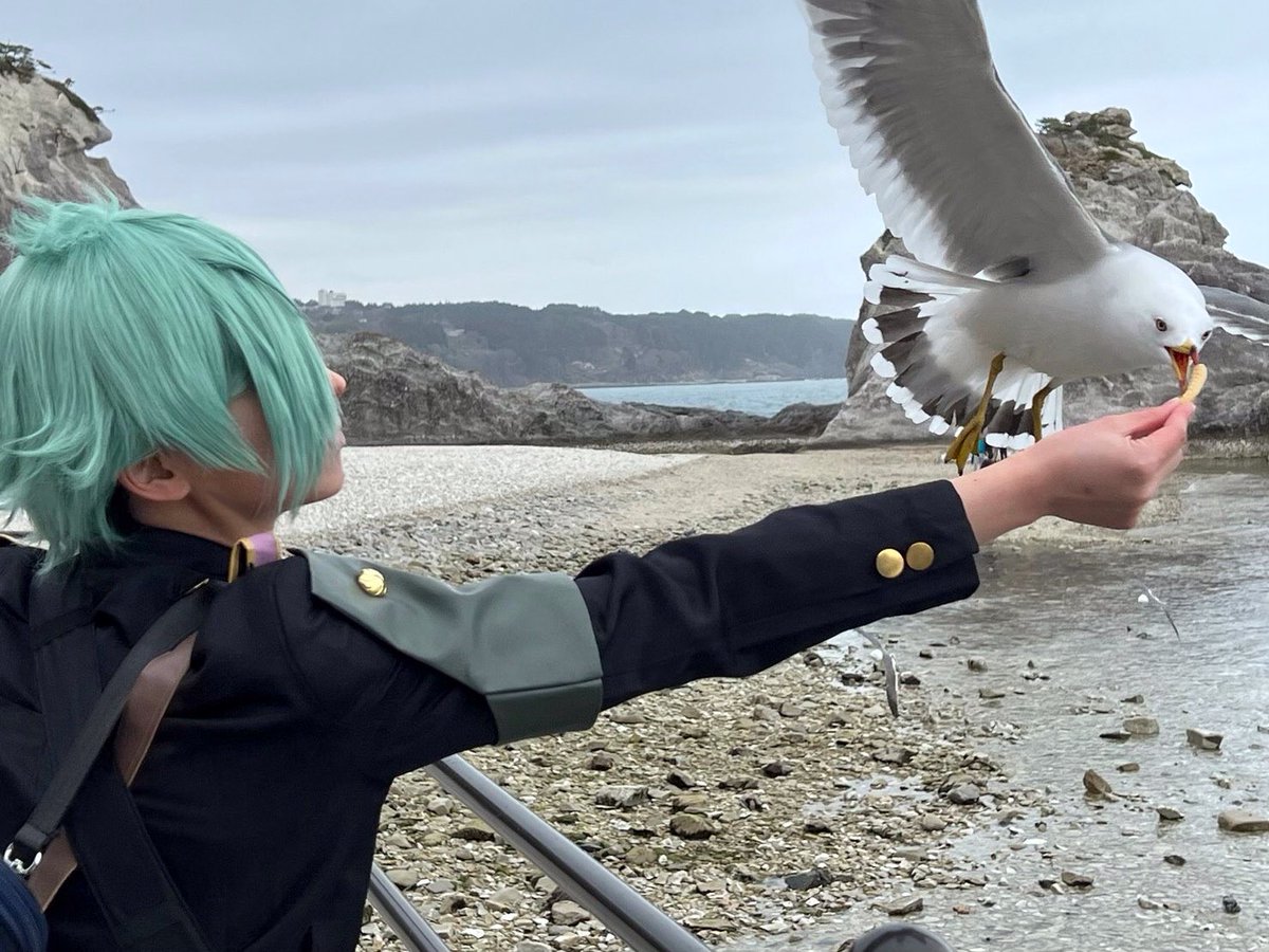 cos オフショ (※撮影地許可済み) ウミネコに餌やりする丸🕊 1回も指咬まれなかったぜ✌️ 決定的瞬間を撮ってくれた📸:春崎さん(@8Lu_3Ki_bk )