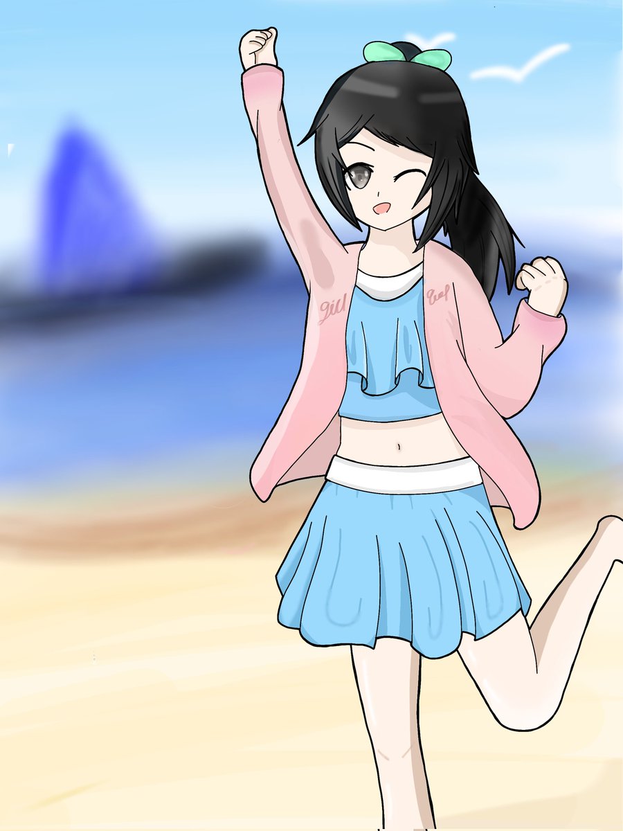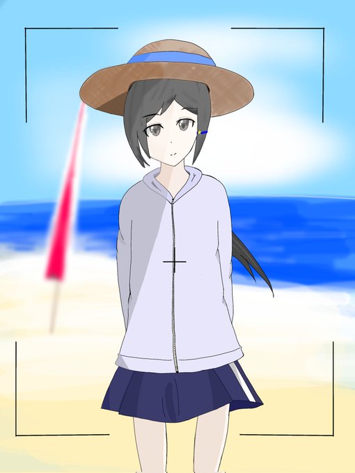 #イラスト もう夏終わったけど海と水着のオリキャラを描きました。 帽子が変になってしまった…