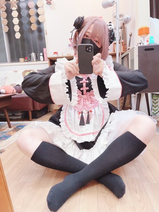 おじさんが可愛い衣装を着てるのにあぐらかいて自撮りしている写真🥳